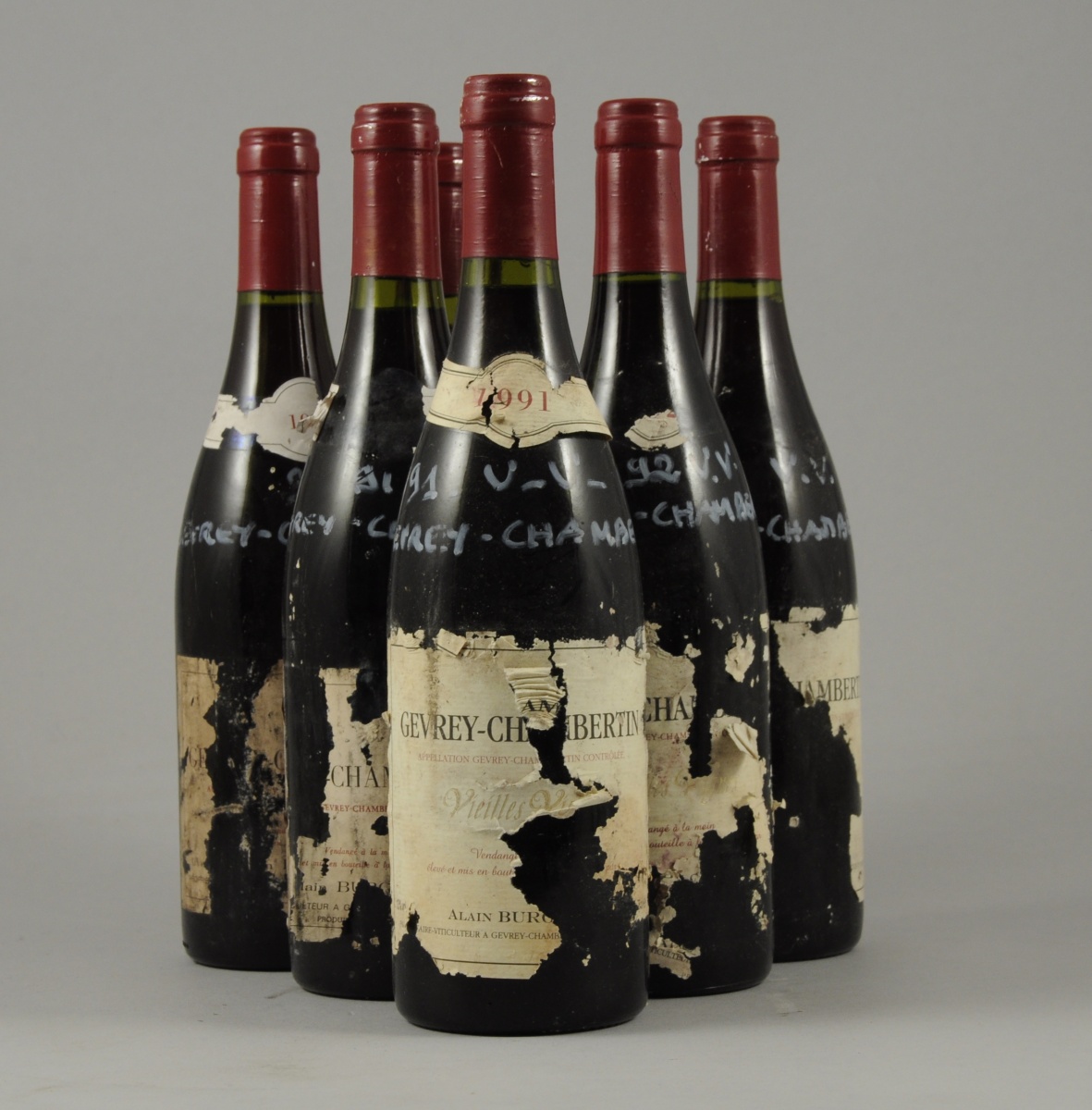 GEVREY-CHAMBERTIN, Vieilles Vignes, 1991. 5 bouteilles, 1992. 1 bouteille. Etiquette très abimées, voir absente.