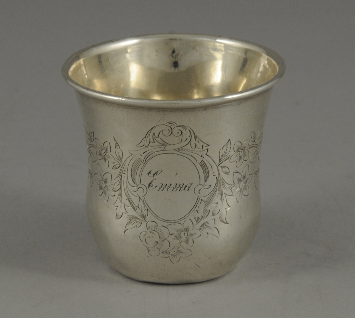 TIMBALE de forme TULIPE en argent. Elle est ciselée d'une frise de fleurs et feuillages et d'un cartouche de forme ovale orné de rinceaux feuillagés et guirlande de fleurs marqué "Emma".