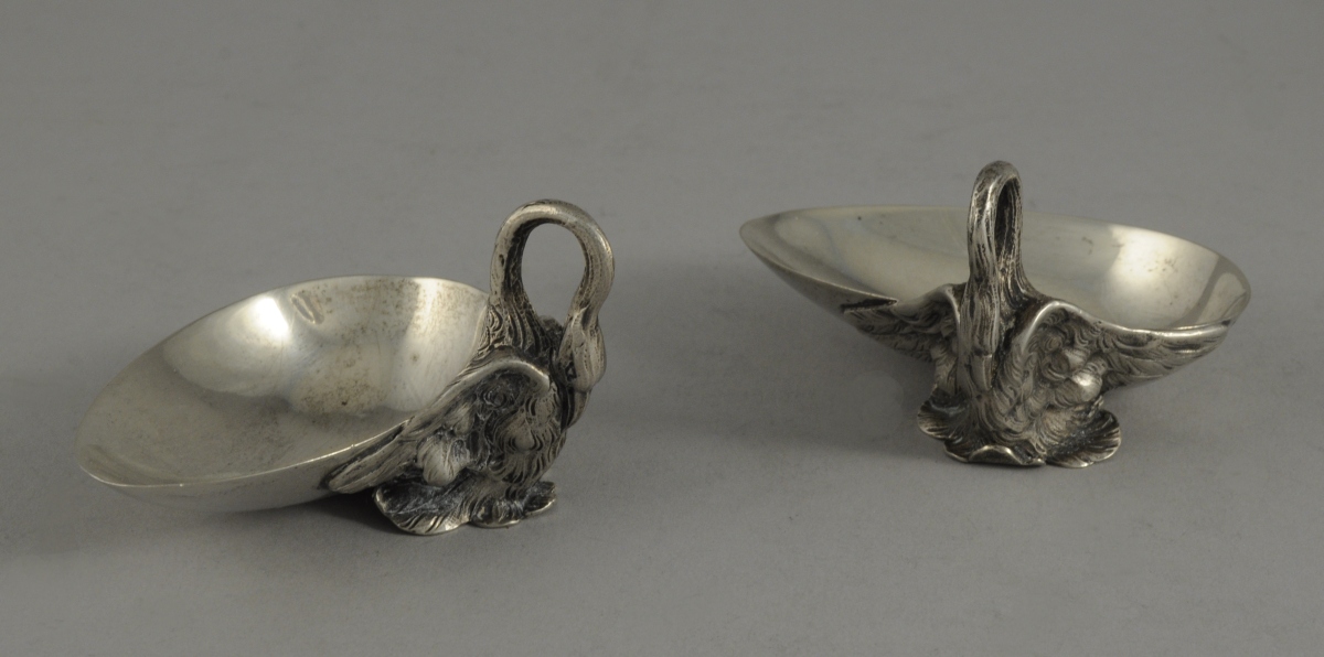 Paire de SALIÈRES en argent. Elles figurent un oiseau à long cou soutenant de ses ailes un réceptacle de forme ovoïde. Poinçon "800" et "BROGGI".