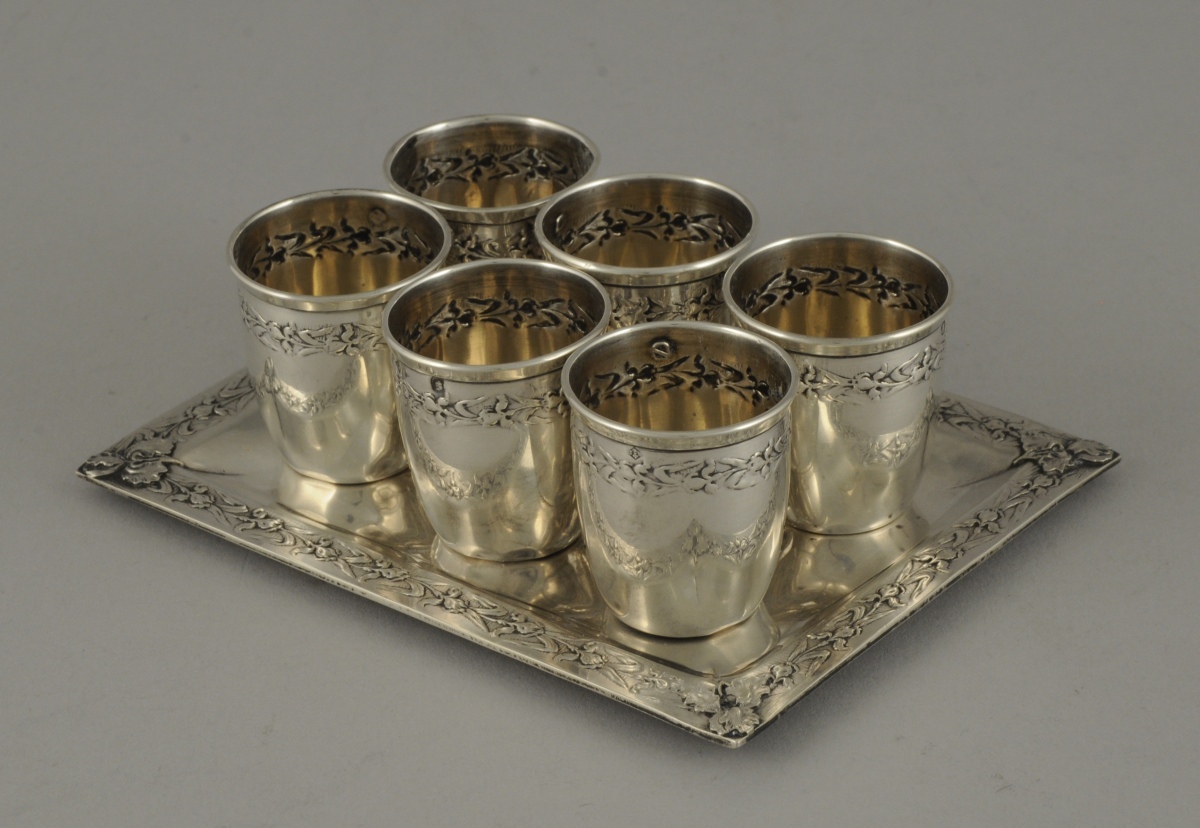 6 GOBELETS À LIQUEUR ET LEUR PLATEAU en argent. Décor naturaliste d'iris.