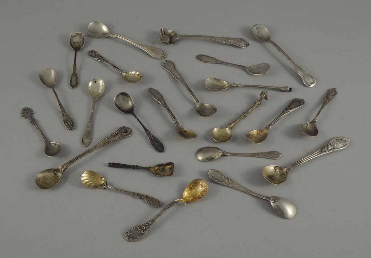 Lot de 23 CUILLÈRES À SEL en argent dont : certaines avec le cuilleron en vermeil, un riche décor de style rocaille, un modèle au noeud gordien, des cuillerons de forme coquille, l'une ciselée d'une tête de femme, une avec la spatule en palmette...