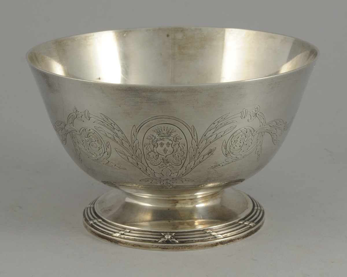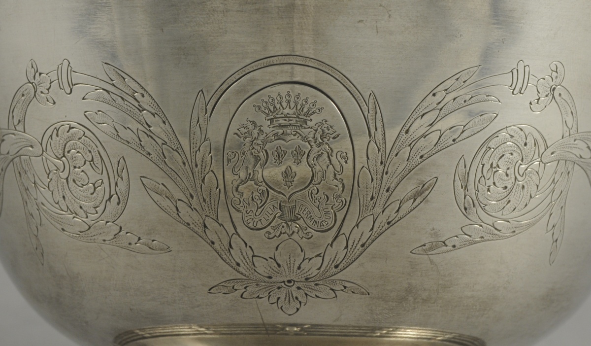 BOL évasé en argent reposant sur un piedouche. Il est gravé de deux médaillons flanqués de volutes feuillagées contenant les armes de la famille de Cargoët (d'argent à trois fleurs de lys de gueules). Sommé d'une couronne comtale, l'écu est supporté par deux lions et souligné d'un listel portant la devise : "Sicut Lilia Germinabunt". Le piedouche orné d'une frise de joncs rubannés.