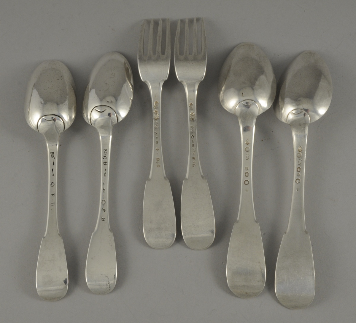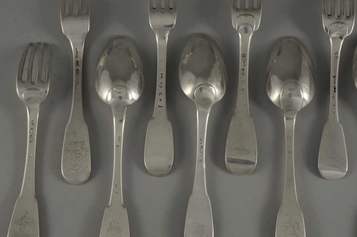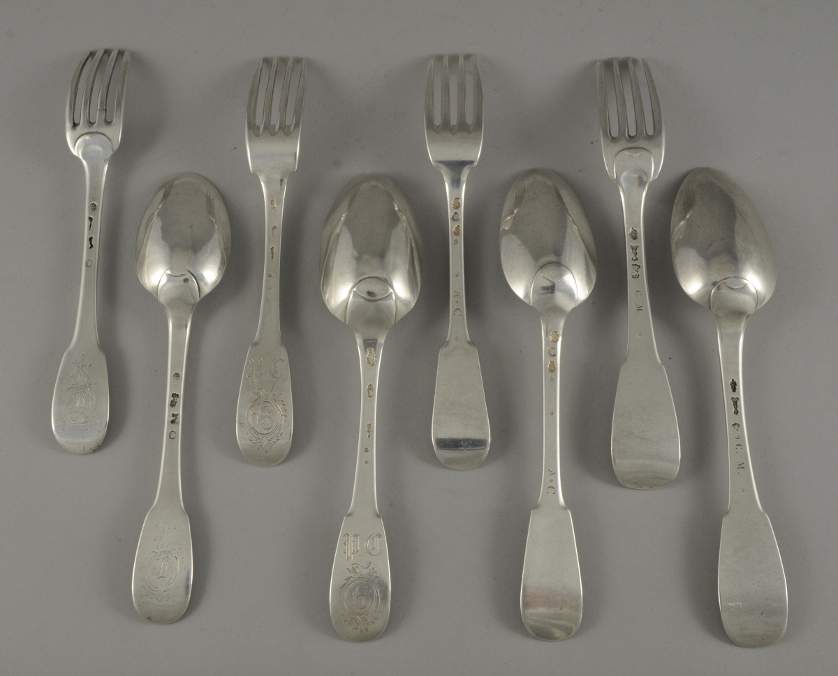 -5 FOURCHETTES et 3 CUILLÈRES aux Fermiers Généraux dont : Paris, 1775-1781; Paris, 1781; Paris, 1783-1789; et une fourchette et une cuillère, Paris, 1789. 2 fourchettes monogrammées dans un cartouche et 2 cuillères gravées d'un écu armorié