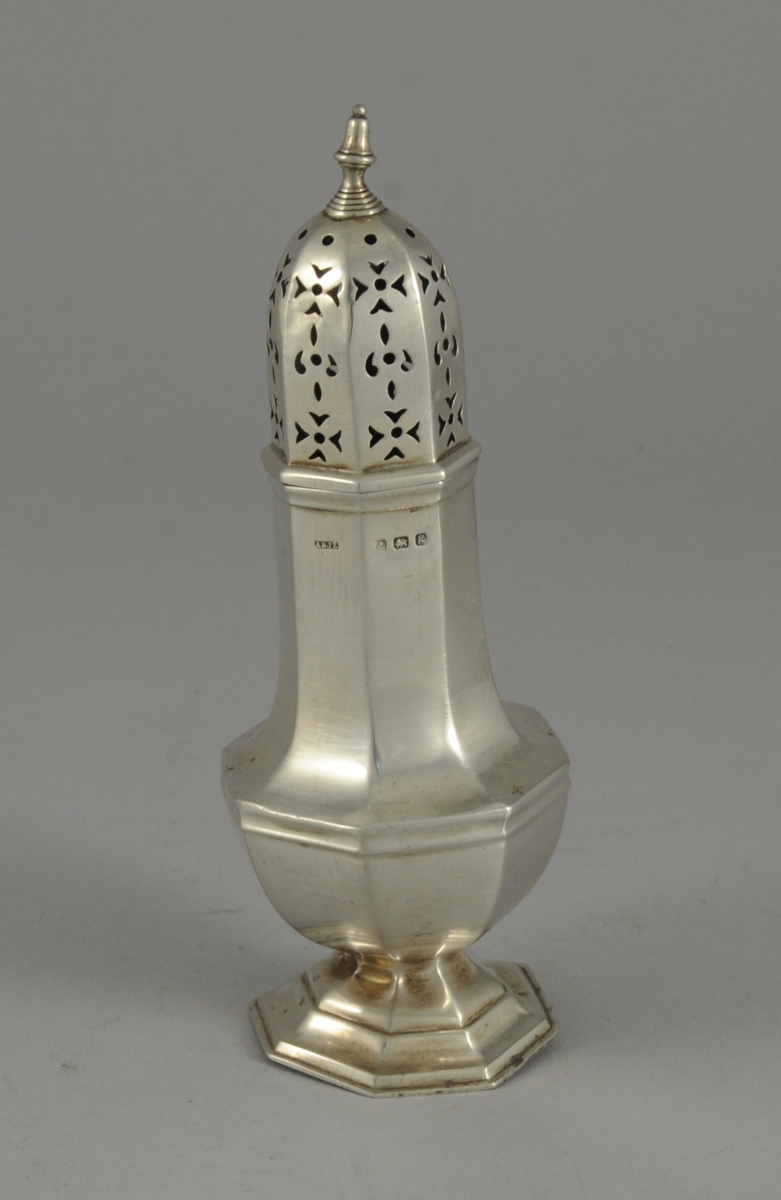 - SAUPOUDREUSE de forme balustre à pans coupés. Le couvercle ajouré, notamment en croix de Malte, sommé d'un fretel toupie. Elle repose sur un piedouche octogonal.