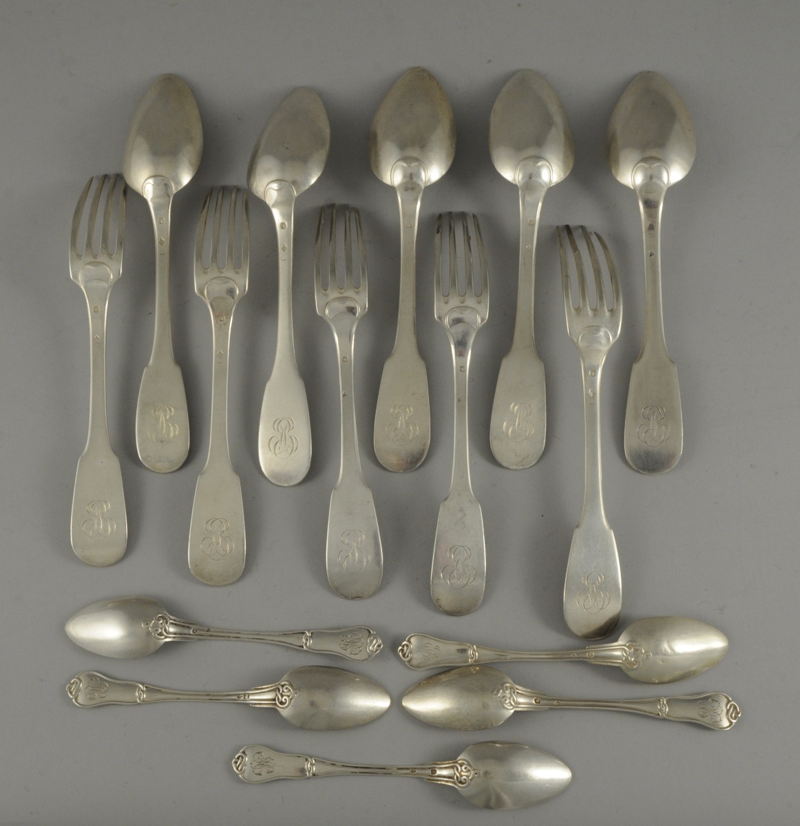 Poinçon Minerve 1er titre. XIXème.Maîtres-Orfèvres : pour deux couverts : H. Fres, des flammes, une étoile; pour deux cuillères et une fourchette : ND, une roue d'engrenage; pour deux fourchettes : L, une croix latine, L.