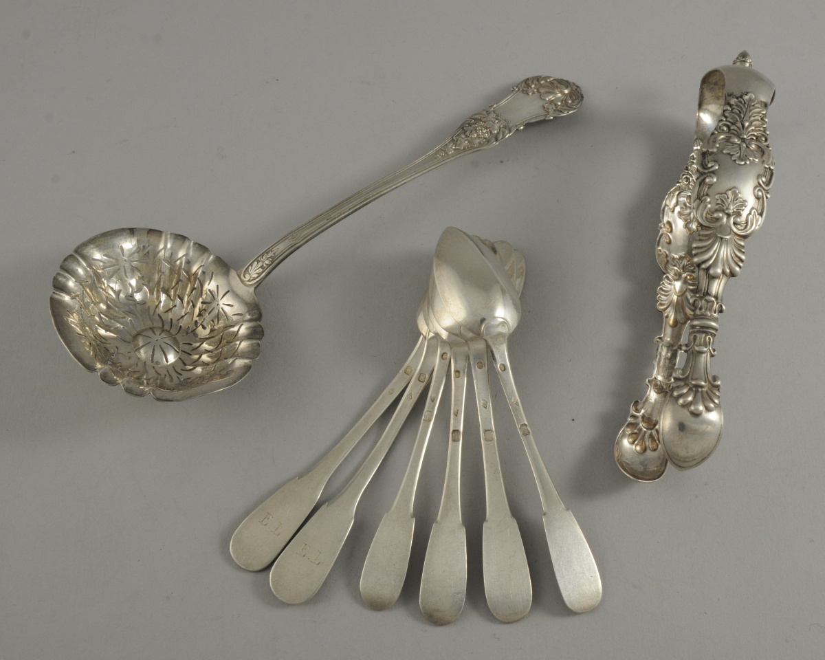 - SAUPOUDREUSE, la spatule de forme violonée à décor de coquille, feuilles d'acanthe stylisées et pampre de vigne. Le cuilleron repercé orné de godrons. Poinçon Minerve, fin du XIXème. Poinçon d'orfèvre une étoile, V.V, une étoile. Poids : 50 g.