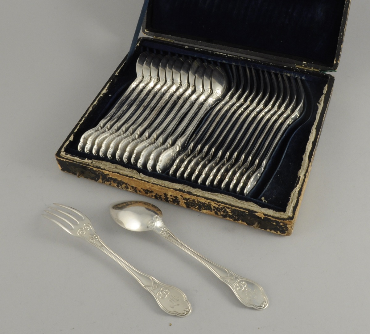 Suite de 12 COUVERTS en argent. Elle reçoit un décor composé de volutes et entrelacs. Les spatules adoptent une forme chantournée. Monogramme "LM". Dans leur coffret portant le même monogramme.