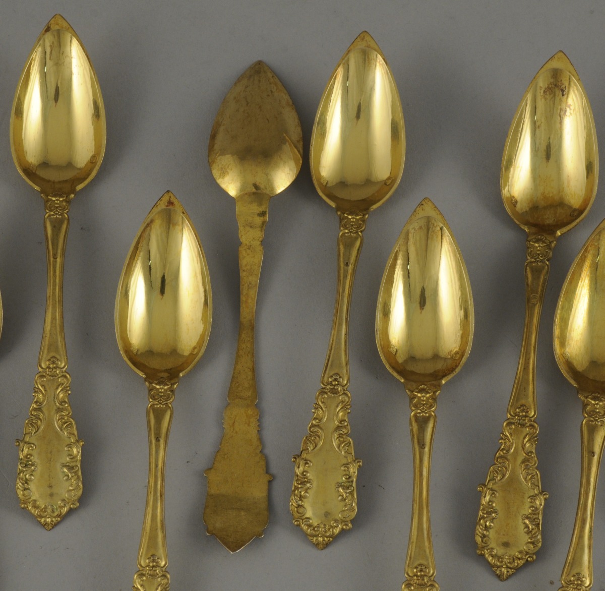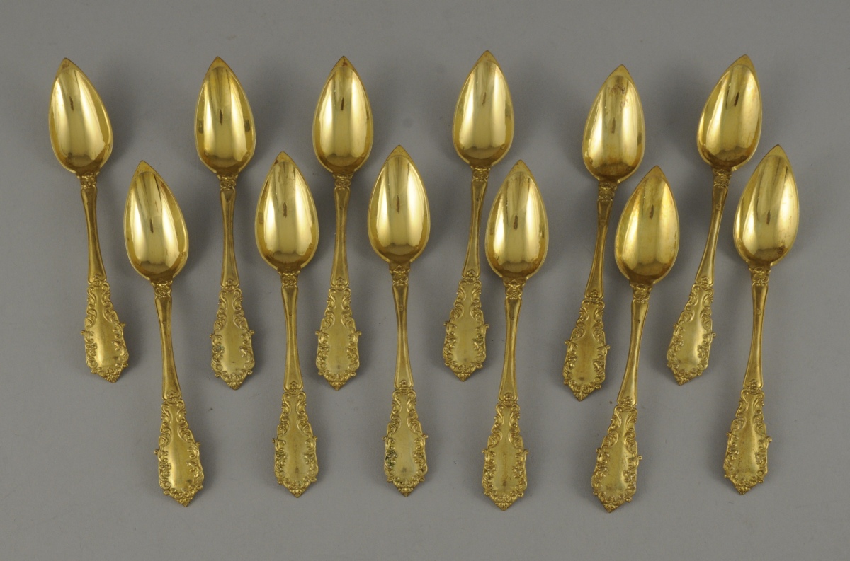 Suite de 12 PETITES CUILLÈRES en vermeil richement ciselées de rinceaux feuillagés.