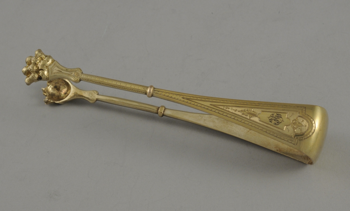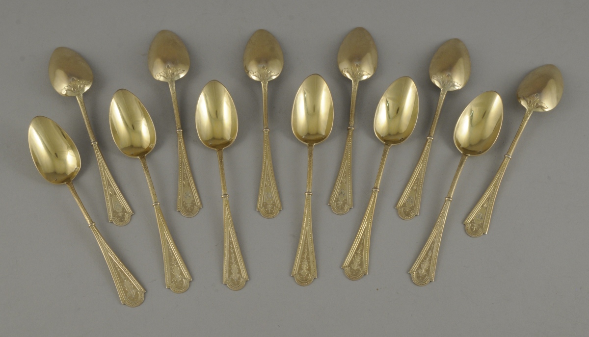 Suite de 12 CUILLÈRES À CAFÉ et leur PINCE À SUCRE en vermeil. Ornementation de frises de dents de loups, fleurons et feuillages stylisés sur fond guilloché. La pince à sucre à pattes de lion. Monogramme "HI".