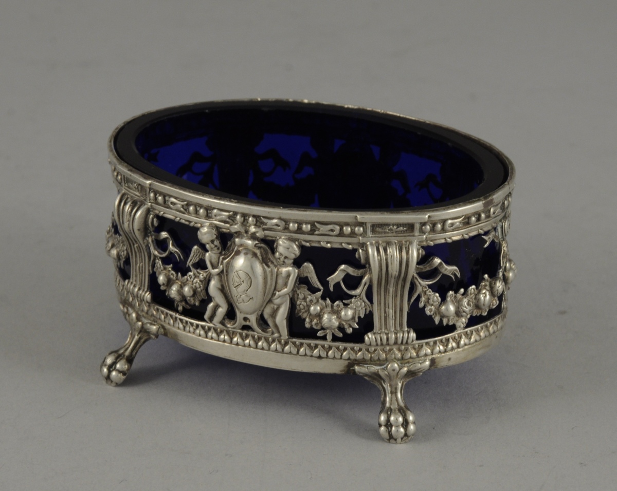 Suite de 4 SALERONS de forme ovale en argent à décor au repoussé d'angelots soutenant un écu gravé d'un heaume, guirlandes de fruits, rubans et consoles cannelées . Ils posent sur quatre pieds griffe. Intérieur en verre bleu.