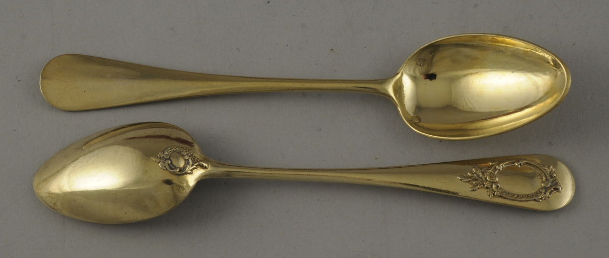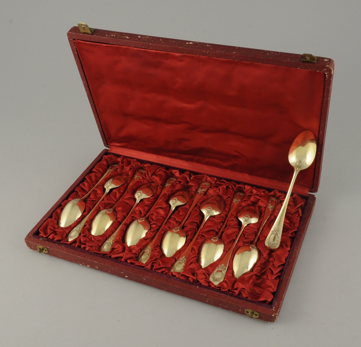 Suite de 12 CUILLIÈRES À CAFÉ en vermeil. Elles sont ornées de deux cartouches feuillagés.