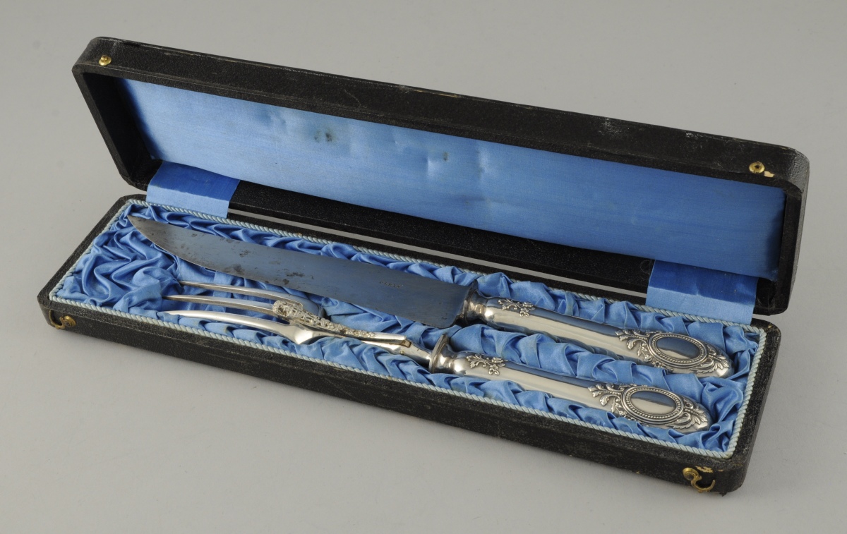 FOURCHETTE et son COUTEAU À DÉCOUPER en argent. Le manche en argent fourré orné d'un cartouche feuillagé de forme ovale. La lame en acier marquée "Paris", le fourchon en métal argenté.