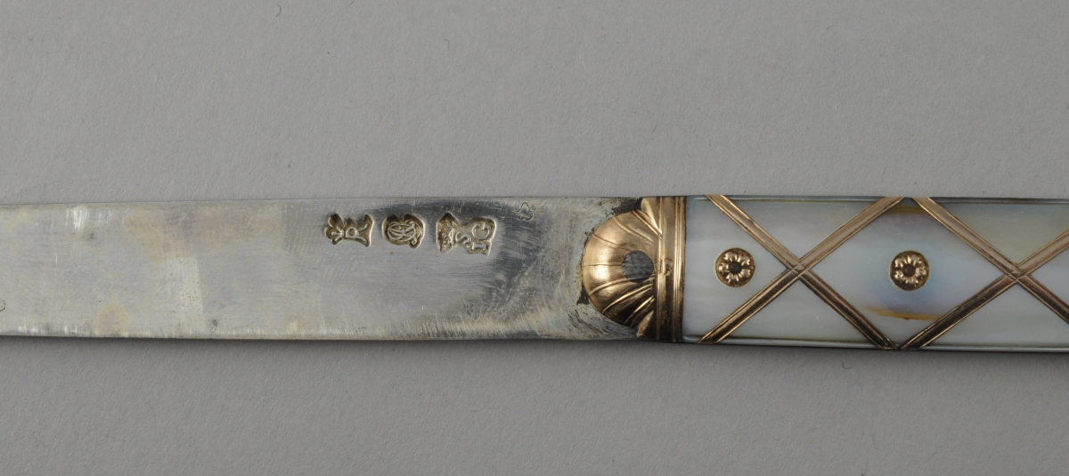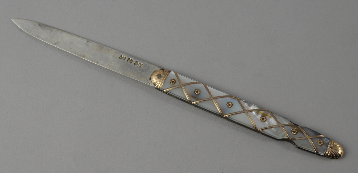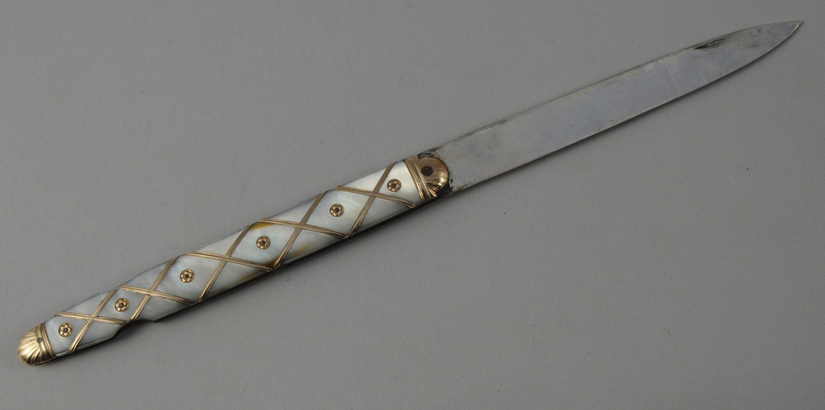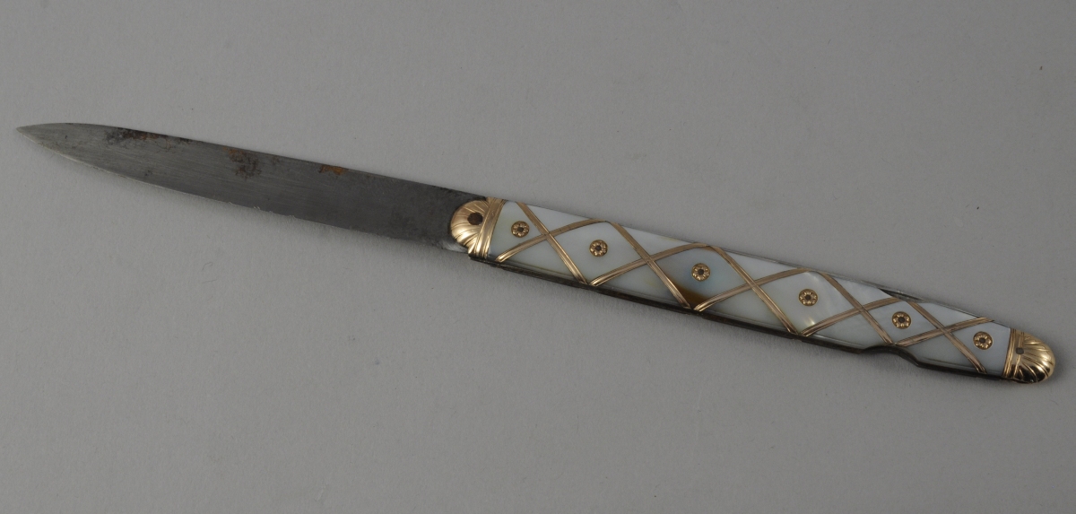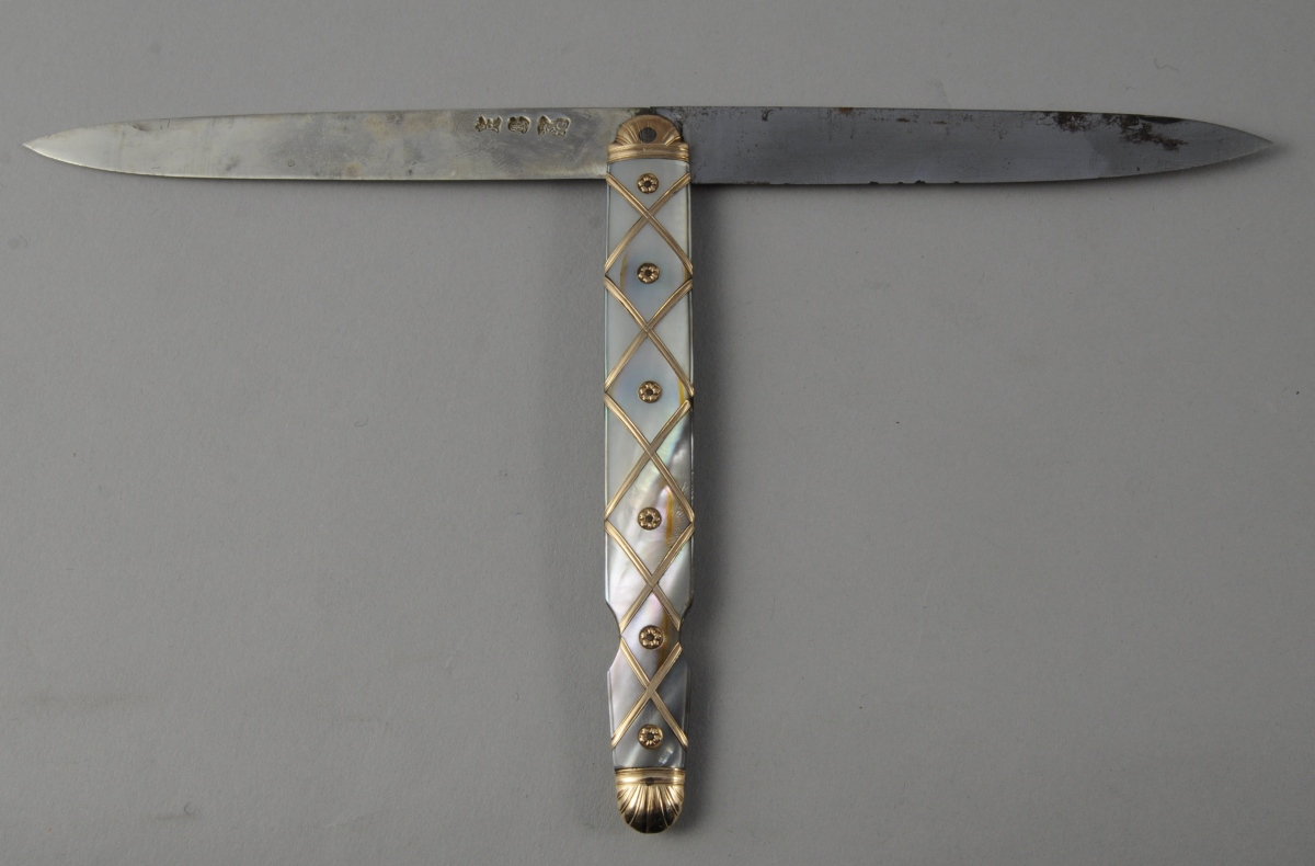 COUTEAU DE VOYAGE dit "à tête de compas" à lame double en acier et argent. Manche à plaquettes de nacre incrustées de filets d'or formant quadrillage et de fleurettes d'or sur les cloutages. Mitres en forme de coquille en or.