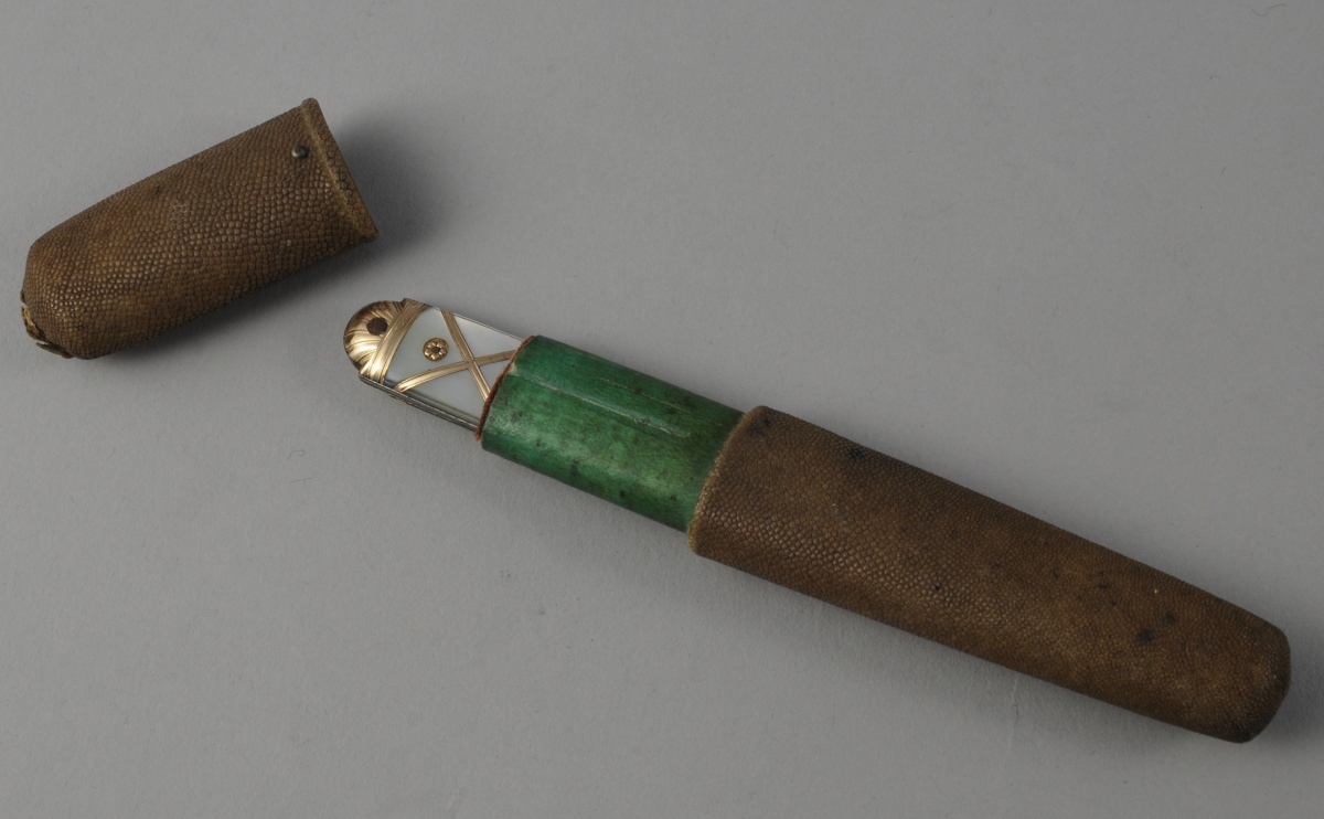 Dans son étui en galuchat brun (accidents). Accompagné d'un papier portant une ancienne mention manuscrite à l'encre : "Couteau ancien de mon arrière gd mère Chauchat"