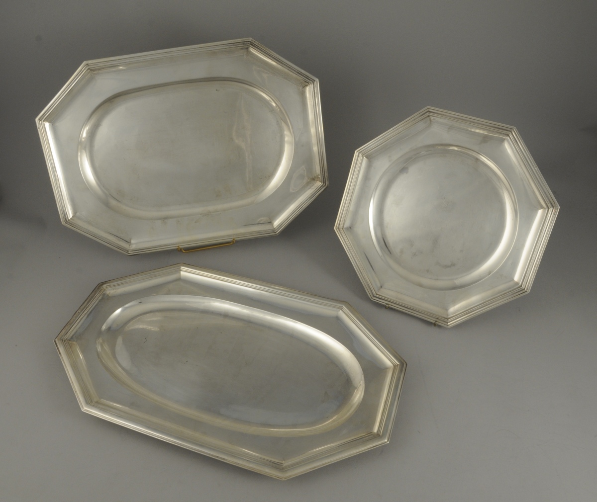 Ensemble de 3 PLATS, modèle à filet. Les deux premiers de forme rectangulaire à pans coupés, le dernier octogonal.