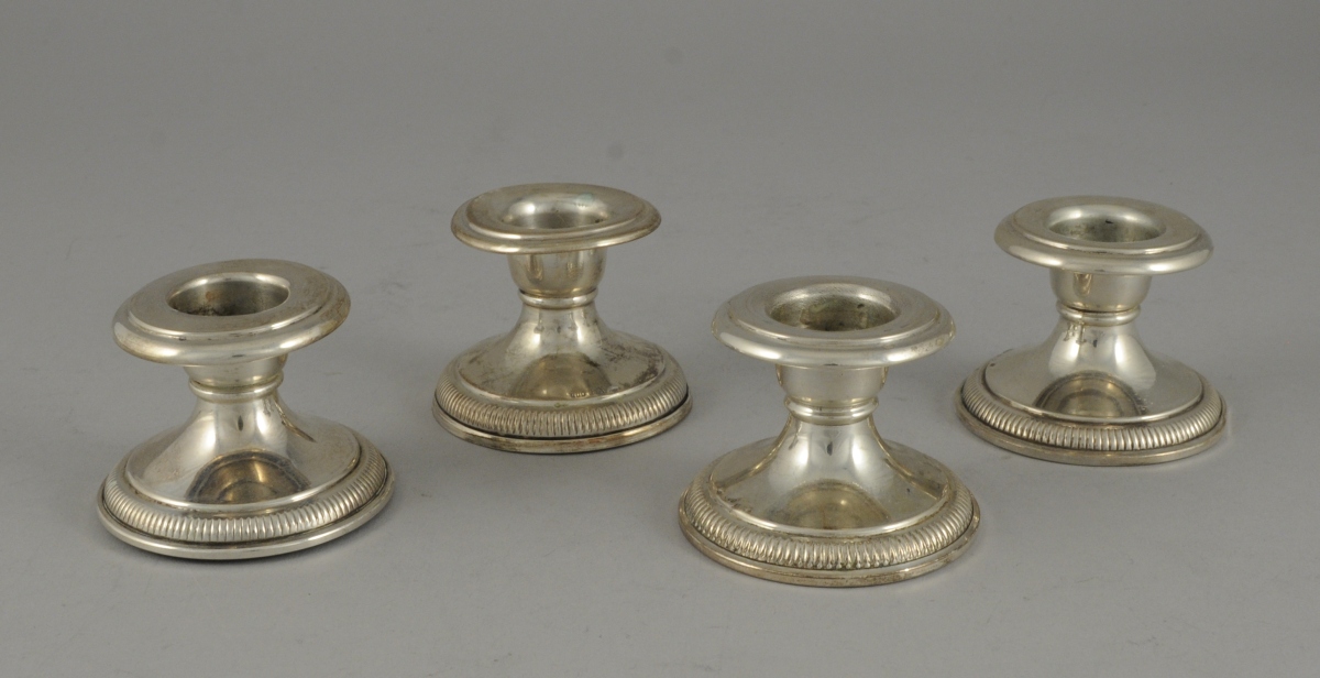 Suite de 4 BOUTS DE TABLE en argent. Reposent sur un pied de forme circulaire à rebord strié. Lestés de cire.
