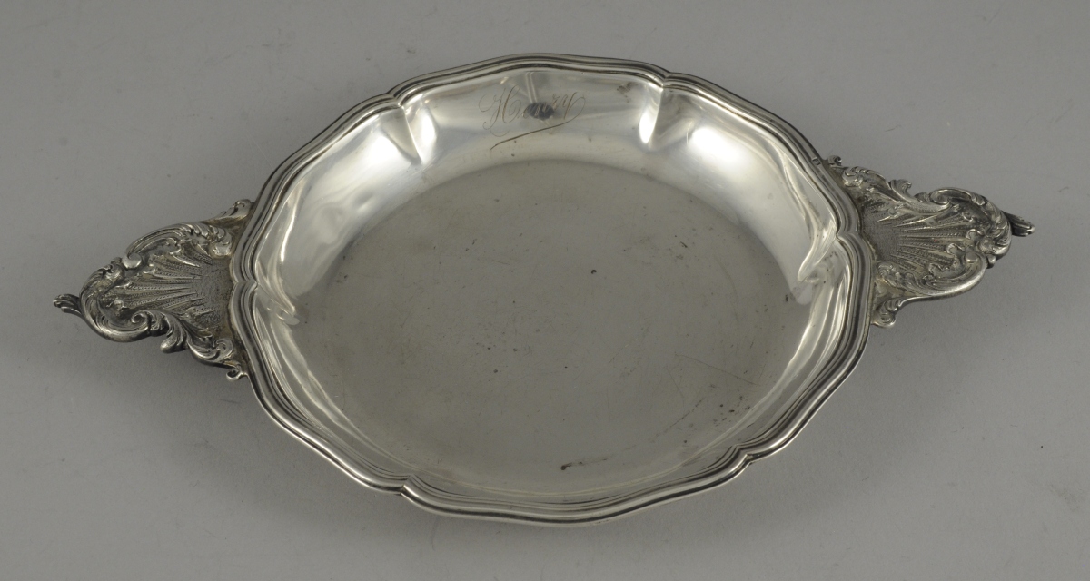 ÉCUELLE À OREILLES en argent, modèle à batte contour. Les oreilles adoptent la forme d'un coquille agrémentée d'agrafes feuillagées.