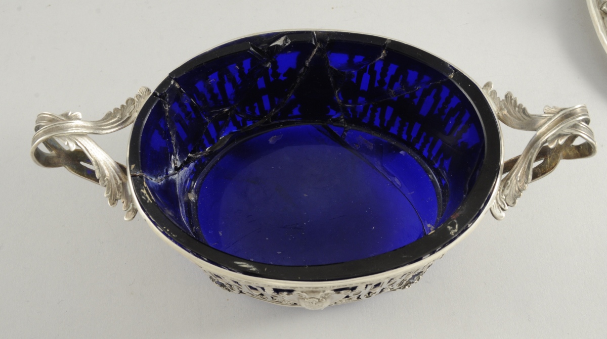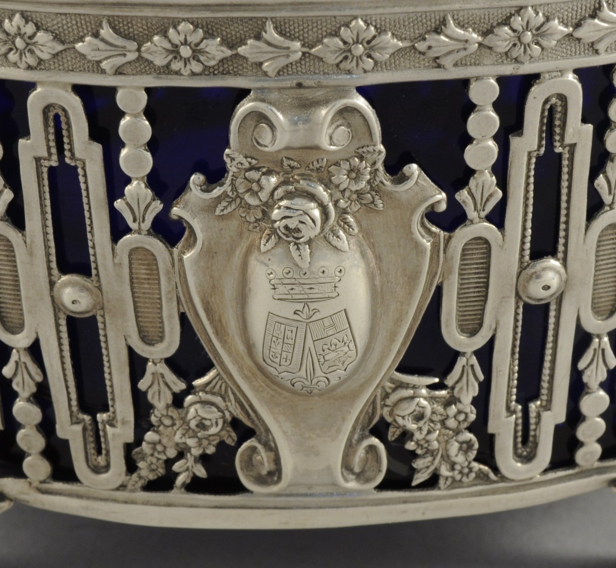 SUCRIER COUVERT de forme ovale en argent garni d'un réceptacle en verre bleu. Décor ajouré de cartouches, grattoirs, pastilles et guirlandes de fleurs. La partie haute ornée d'une frise de fleurons. Il présente deux écu de forme ovale gravés aux armes d'alliance Desrousseau de Médrano et Parent sous un tortil de baron. Encadrement de cuirs découpés. Les anses à décor de feuilles d'acanthe stylisées. Repose sur quatre pieds griffes. Le couvercle est orné au repoussé de cannelures rayonnantes, feuilles d'acanthe stylisées et godrons. Le fretel formé de trois fraises des bois posant sur leur feuillage.