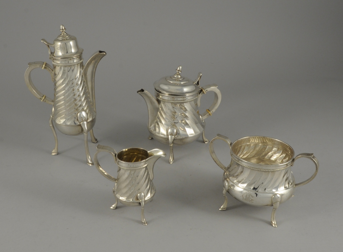 SERVICE À THÉ ET CAFÉ ÉGOISTE de 4 PIÈCES en argent. Il comprend une théière, une cafetière, une verseuse et un sucrier. Repose sur quatre pieds en jarrets. Panses à côtes torses. Fretel adoptant la forme d'une pomme de pin.