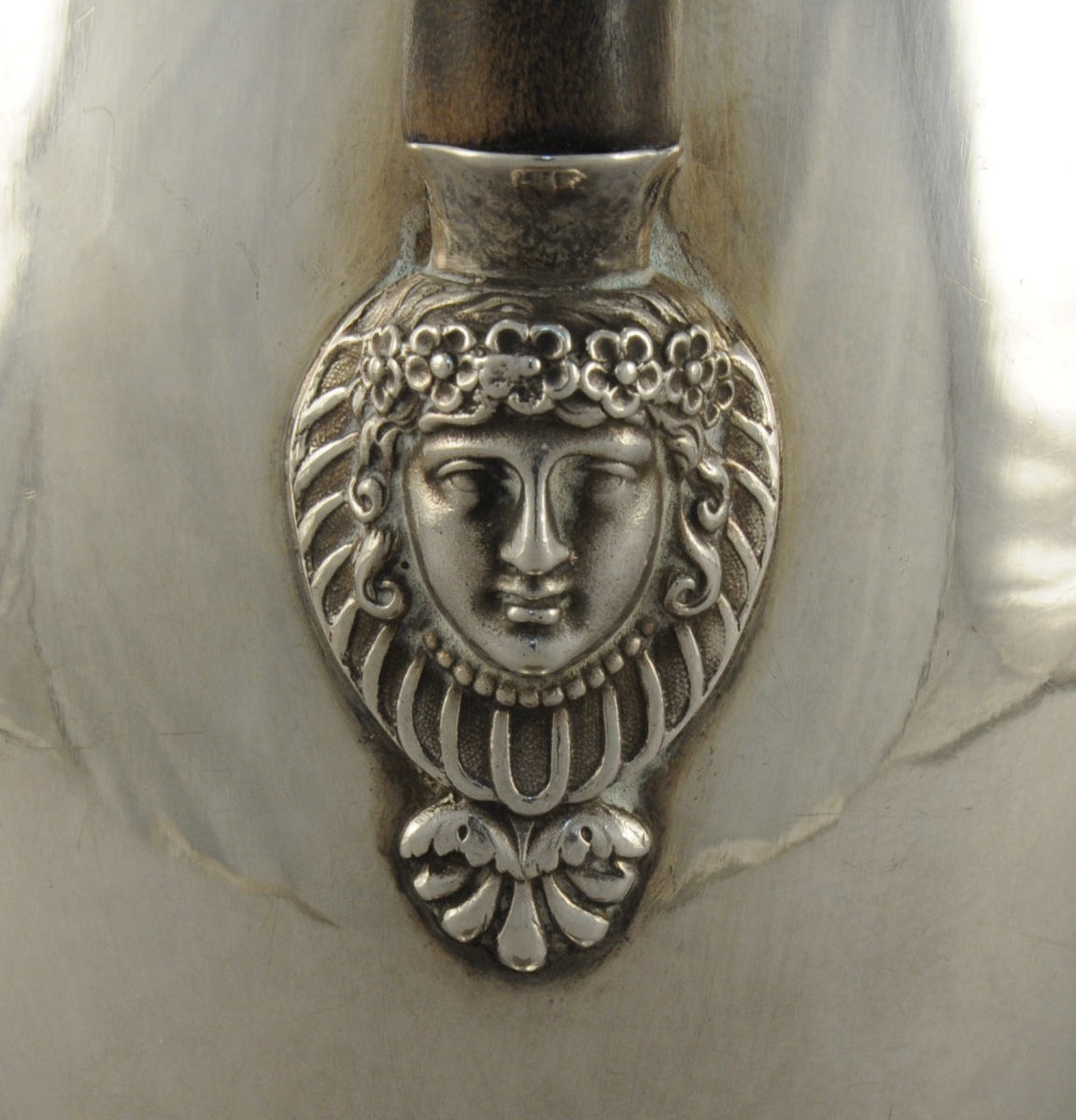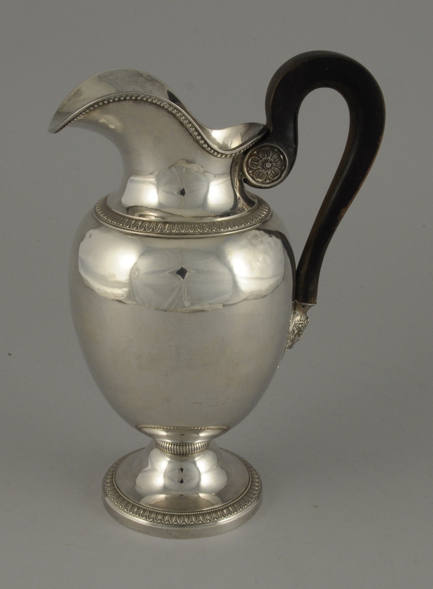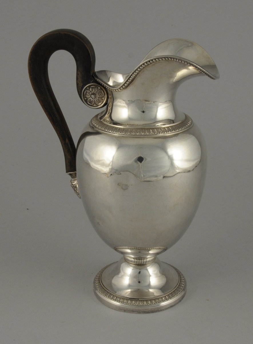 VERSEUSE argent, posant sur un piedouche. Ornementation de frise de feuilles d'eau et rais de perles. L'anse en bois noirci relié au corps par un fleuron et une tête de femme couronnée de fleurs inscrite dans une palmette.