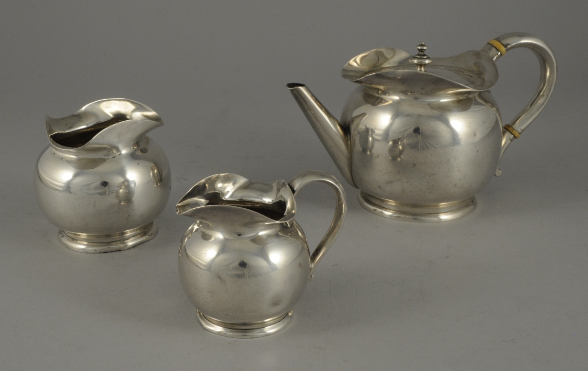 SERVICE À THÉ dit ÉGOÏSTE en argent uni. Il se compose d'une théière, d'un sucrier et d'un pot à lait. L'anse de la théière baguée d'ivoire.