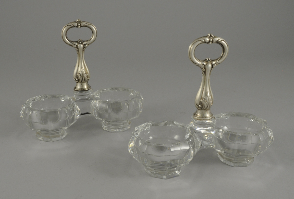 Paire de SALERONS DOUBLES en verre à deux réceptacles de forme octogonale. La prise en argent à motifs feuillagés.