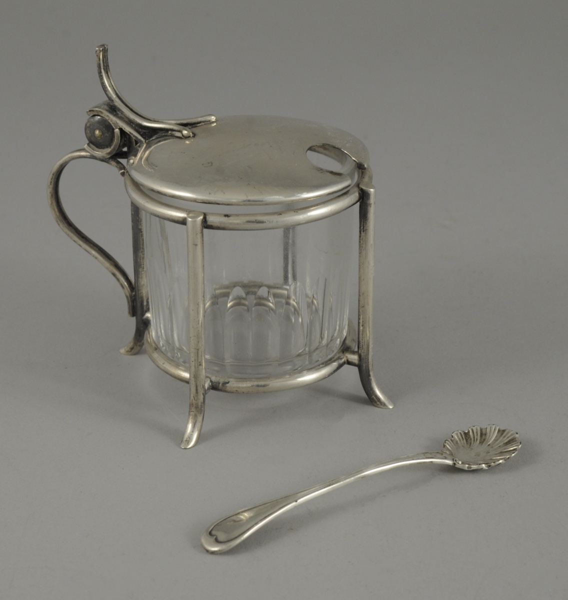 CHRISTOFLE, MOUTARDIER en métal argenté. La structure formée de joncs courbés. Le réceptacle en cristal gravé de cannelures. Haut. 9, Diam. 6,5 cm. XXème.