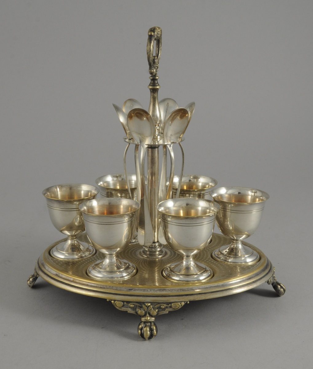 Ils sont présentés avec 6 CUILLÈRES À OEUF en métal argenté sur un PRÉSENTOIR en métal argenté. De forme ovale, il repose sur quatre pieds griffes. La prise formée de deux dauphins affrontés. Le plateau orné de guillochis. XXème.