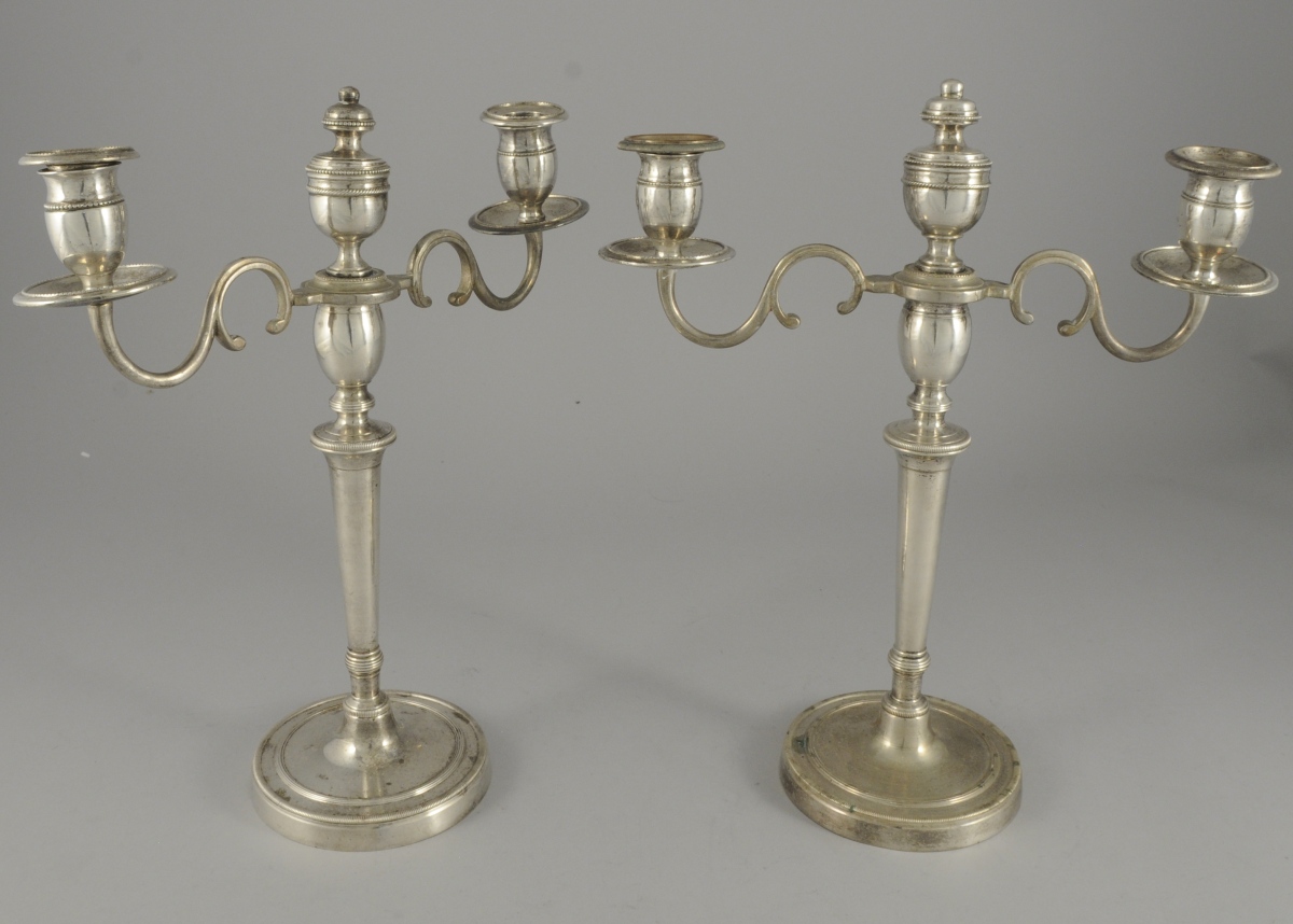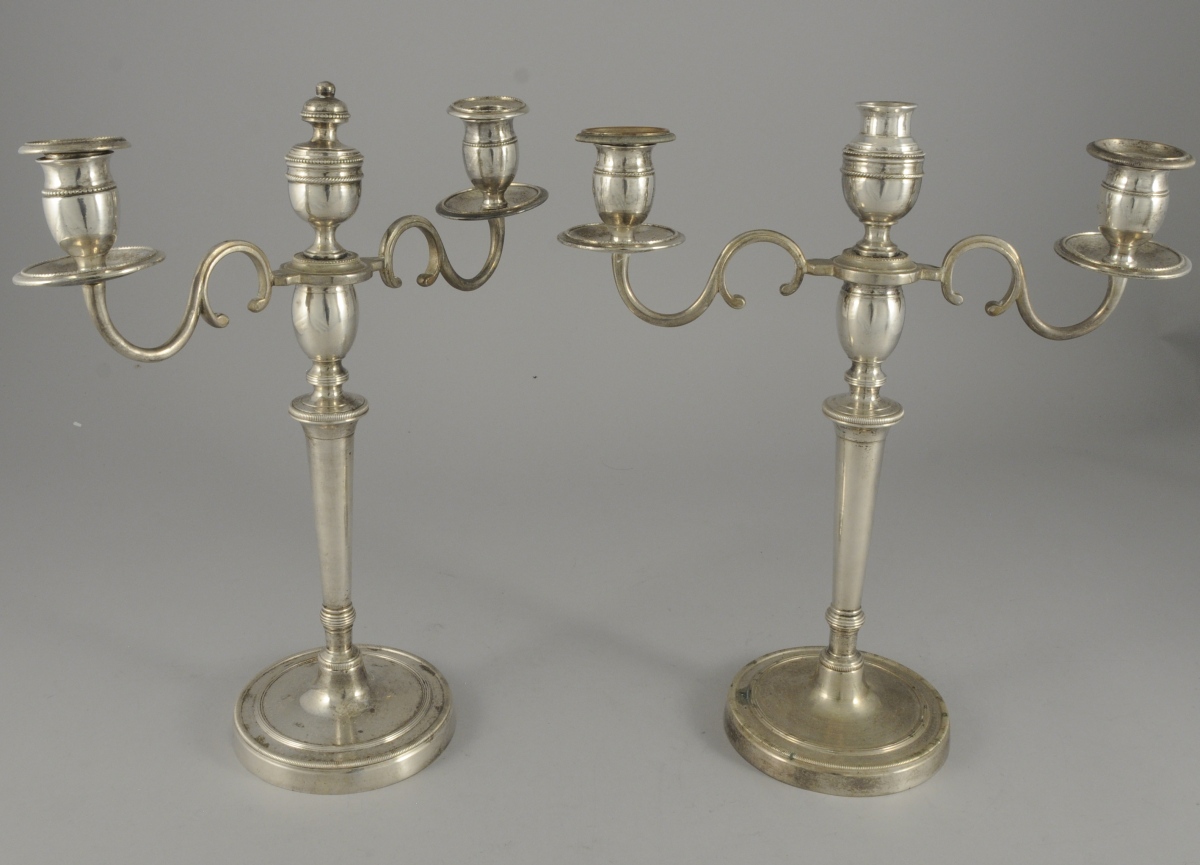 Haut. 35, Larg. 30, Diam. de la base : 12,5 cm. (deux bobèches rapportées)