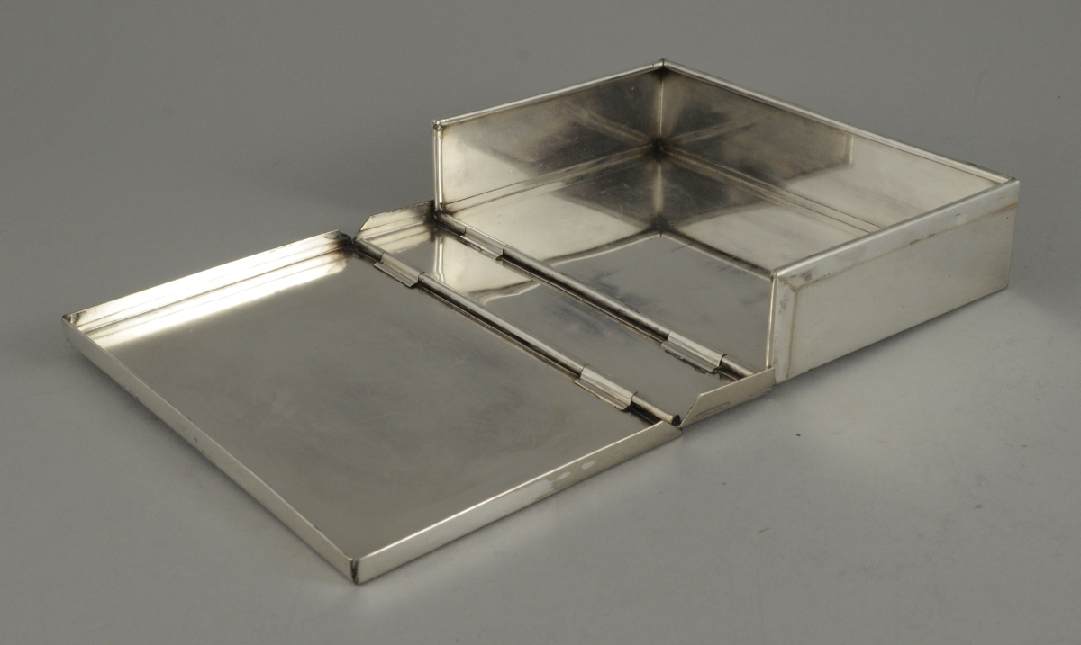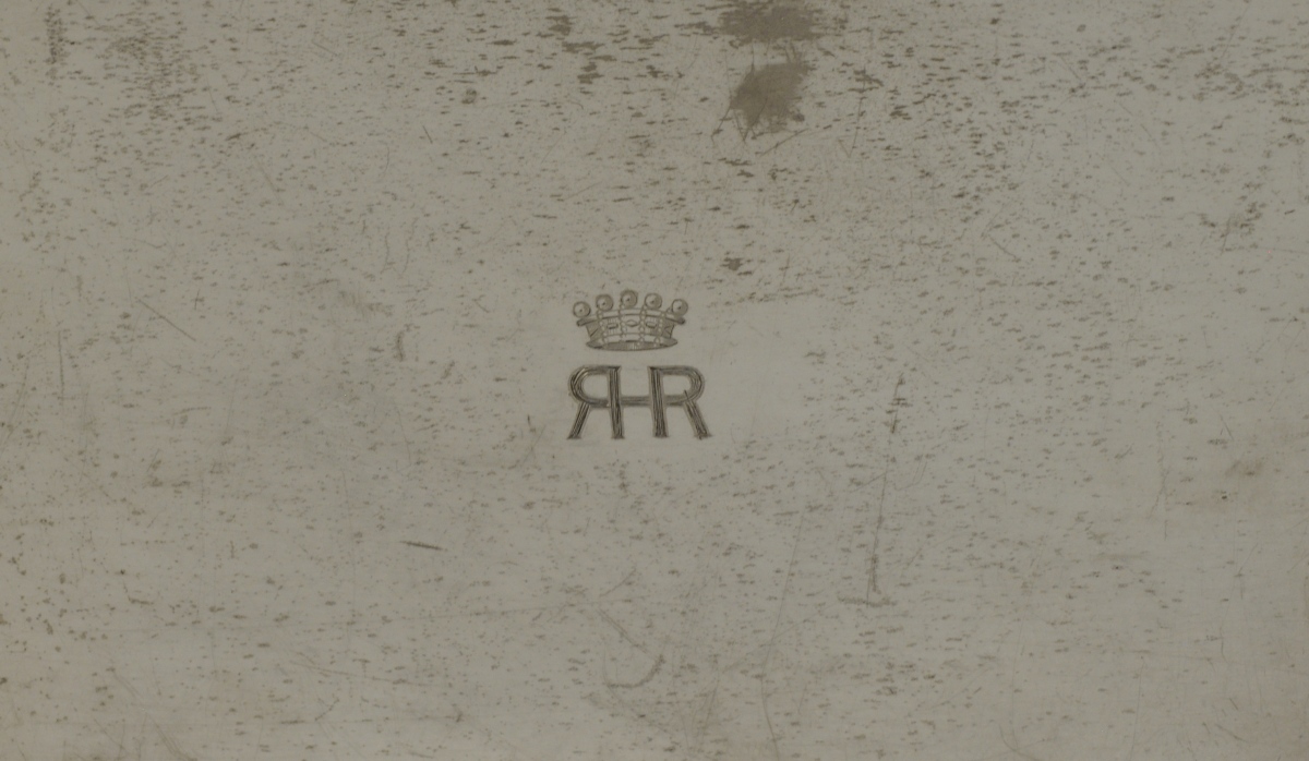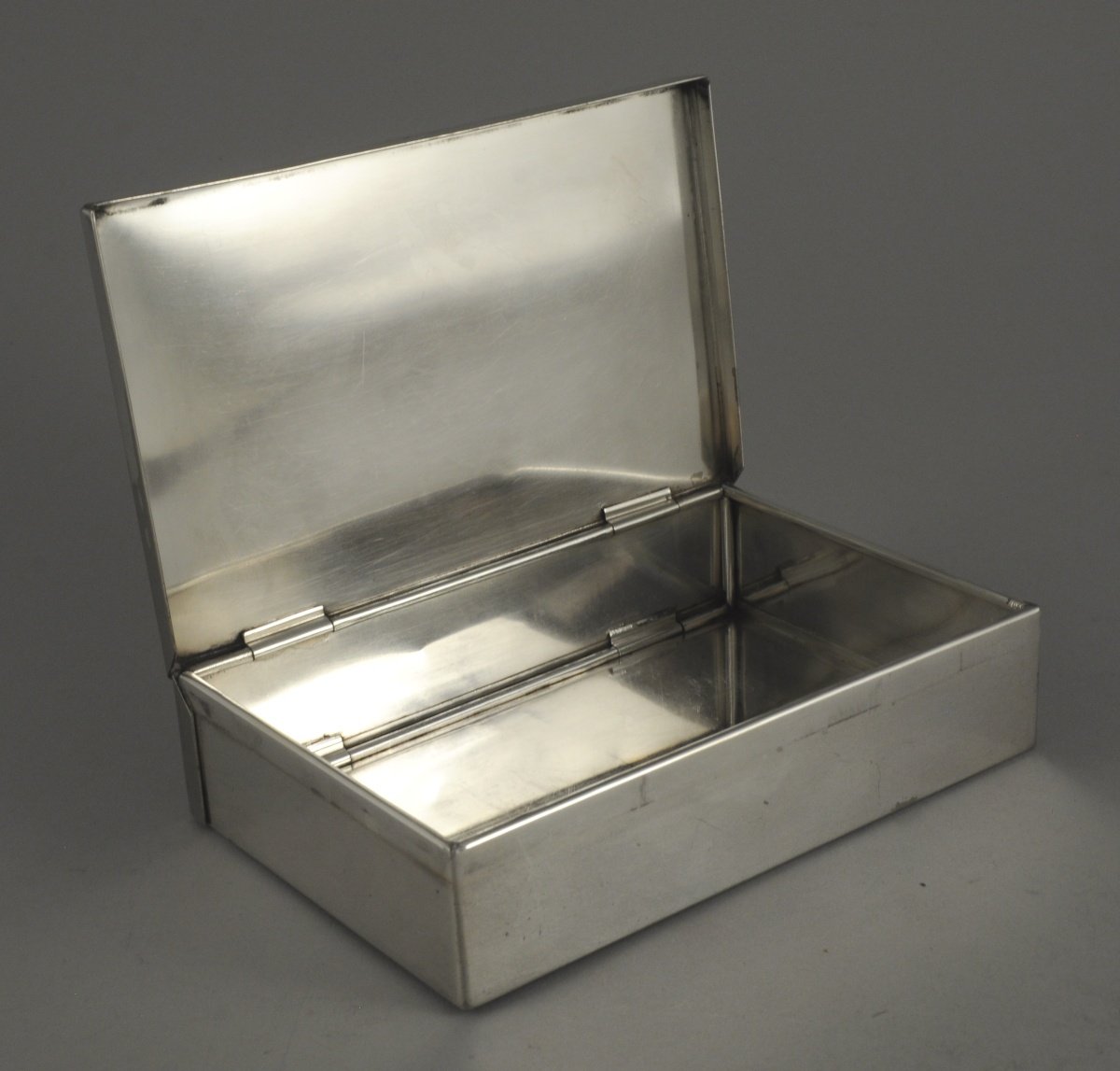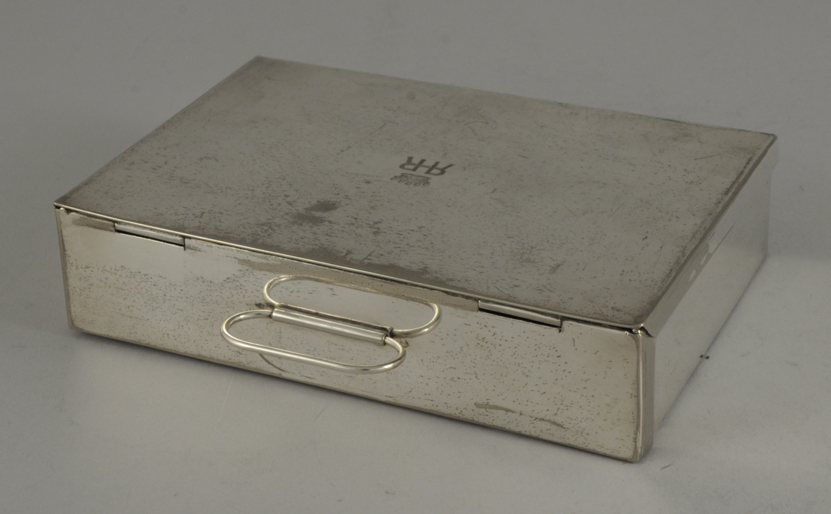 BOITE À CIGARES DU BARON ROBERT DE ROTHSCHILD, de forme rectangulaire en métal argenté, gravée du chiffre "RR" pour sous un tortil de baron, poignée articulée.