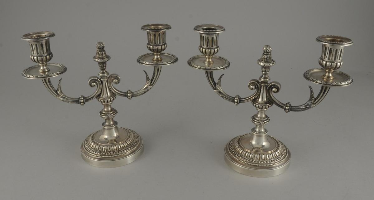 PAIRE de FLAMBEAUX à deux lumières en métal argenté. Ils posent sur un pied de forme circulaire orné d'une frise de feuilles d'eau. Le fût à décor de joncs rubanés, godrons et cannelures présente une toupie sommée d'une pomme de pin à l'amortissement. Les binets adoptent la forme d'un vase médicis ornés de godrons et cannelures.