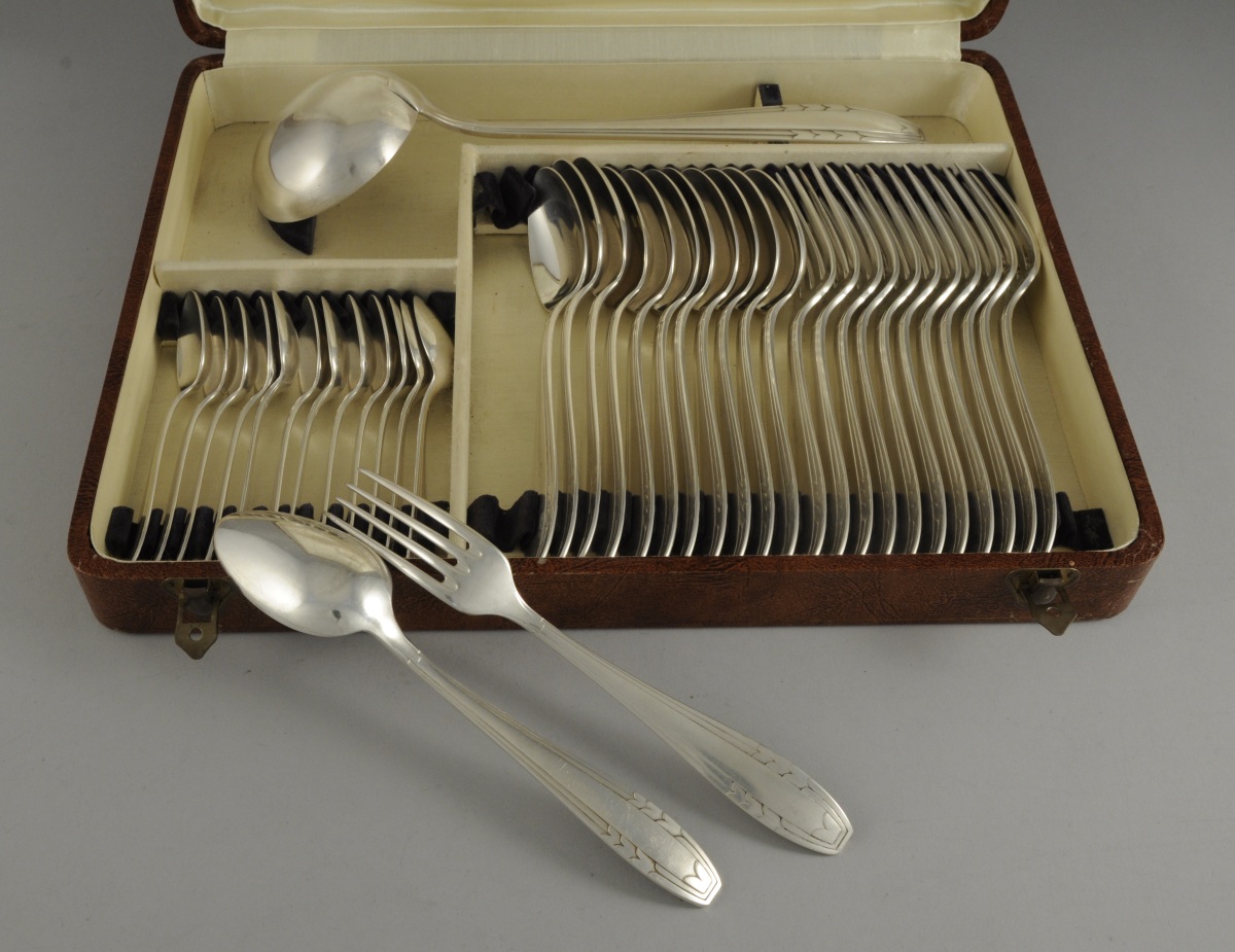 MÉNAGÈRE de 37 pièces en MÉTAL ARGENTÉ à décor géométrisant comprenant 12 COUVERTS DE TABLE, 12 CUILLÈRES À CAFÉ et UNE LOUCHE.