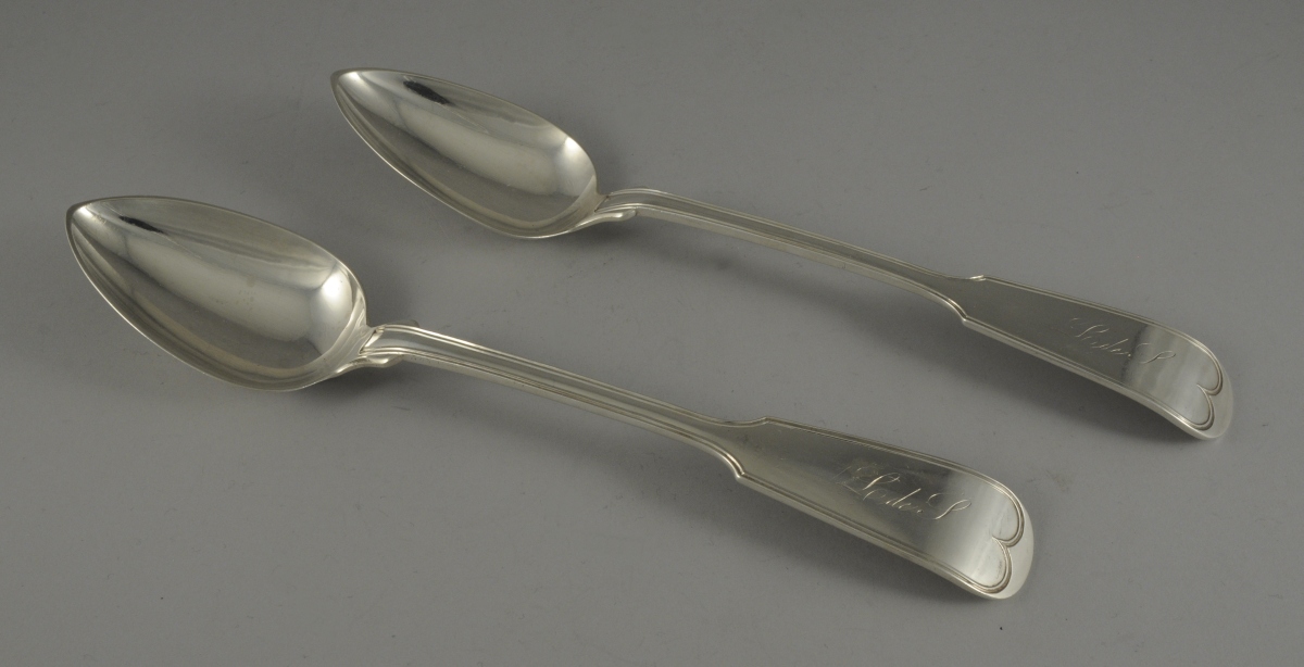 PAIRE DE CUILLÈRES À RAGOÛT en métal argenté. Modèle filet contour. Gravées "L de S". Travail étranger du XXème signé "S & S B BROWER / S".