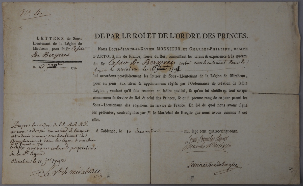 Lettres de Sous-Lieutenant de la Légion de Mirabeau (la célèbre légion d'émigrés des " HUSSARDS DE LA MORT ") pour César de BERGERET, apostillées par le vicomte de Mirabeau (dit Mirabeau-Tonneau), " colonel proprietaire de la dite légion ". RARE.