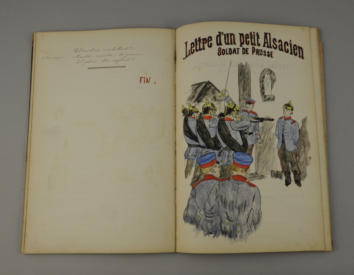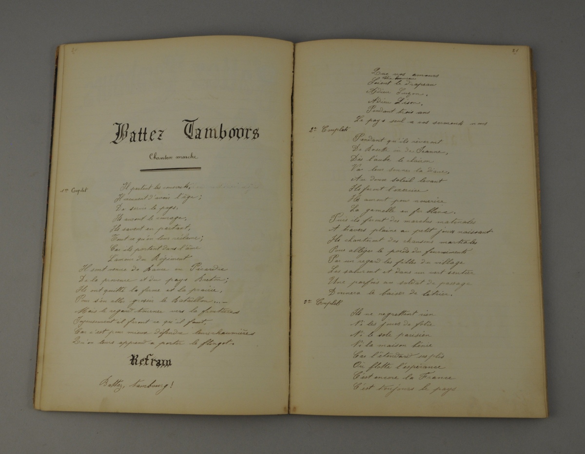RECUEIL manuscrit de chansons et récits patriotiques accompagnés de dessins aquarellés. "Polyte à Berlin", "Le Cheveu blanc", "L'Enfant de Paris", "Battez Tambours", La Défense de Belfort - Denfert - 1871", Le Prisonnier de Strasbourg", "C'est un oiseau qui vient de France", "Maudite soit la guerre !", "Lettre d'un petit Alsacien Soldat de Prusse", "Le Violon Brisé", "Les Dernières Cartouches", "La Voix des Sapins", "Le Clairon", "Le Soldat de Floréal", "Le Reveil de la France". Dessins signés "J. Maguin". Fin XIXème.