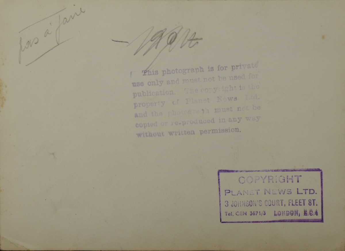 -2 photographies de de Gaulle et son épouse à Londres, avec au dos le cachet gras "Planet News, London ... This photograph is for private use only" (205 X 150 mm)