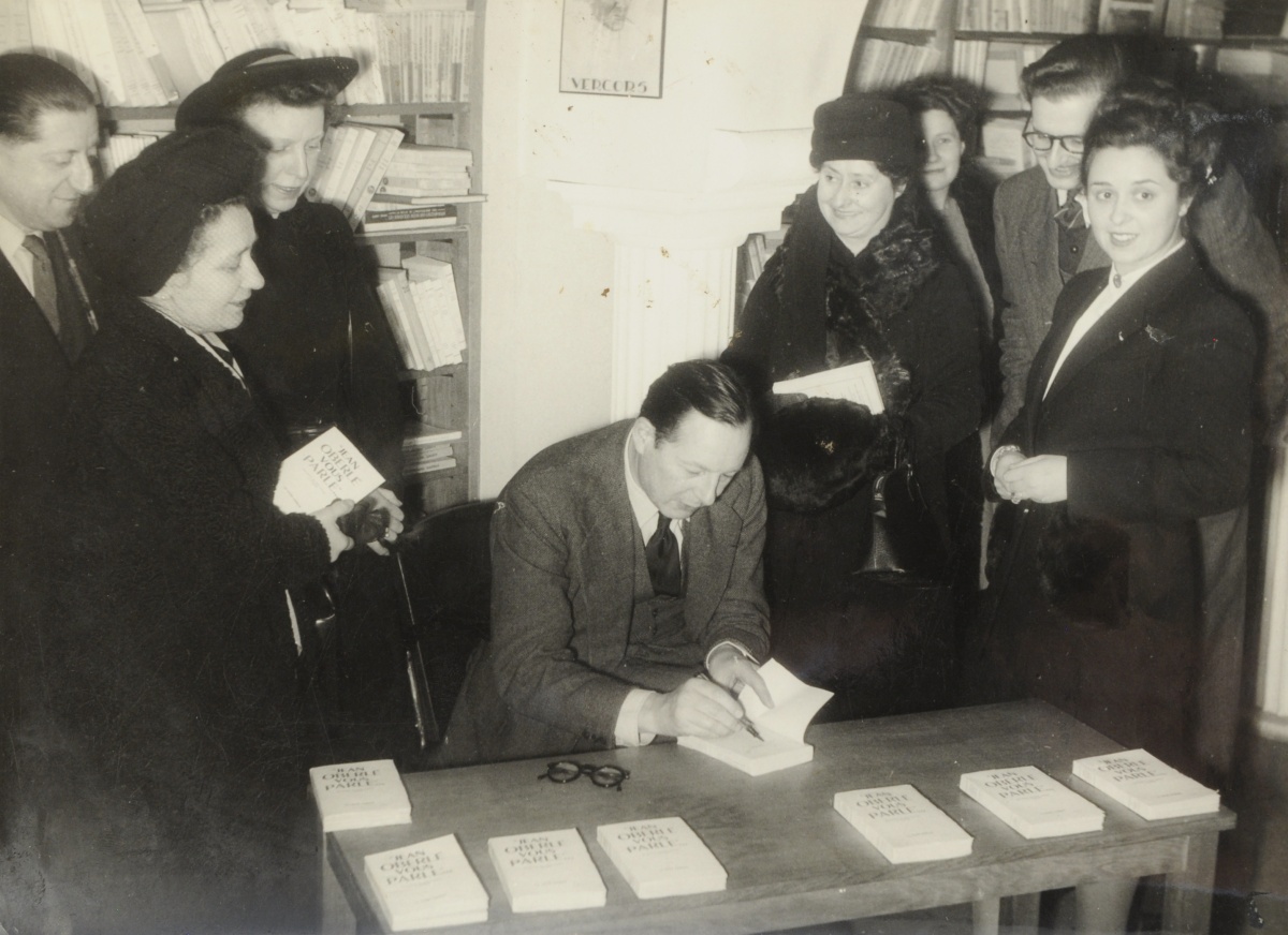 -1 photographie de Jean Oberlé dédicaçant "Jean Oberlé vous parle", datée de Bruxelles, 9/1/47, cliché Sado. (180 X 245 mm).