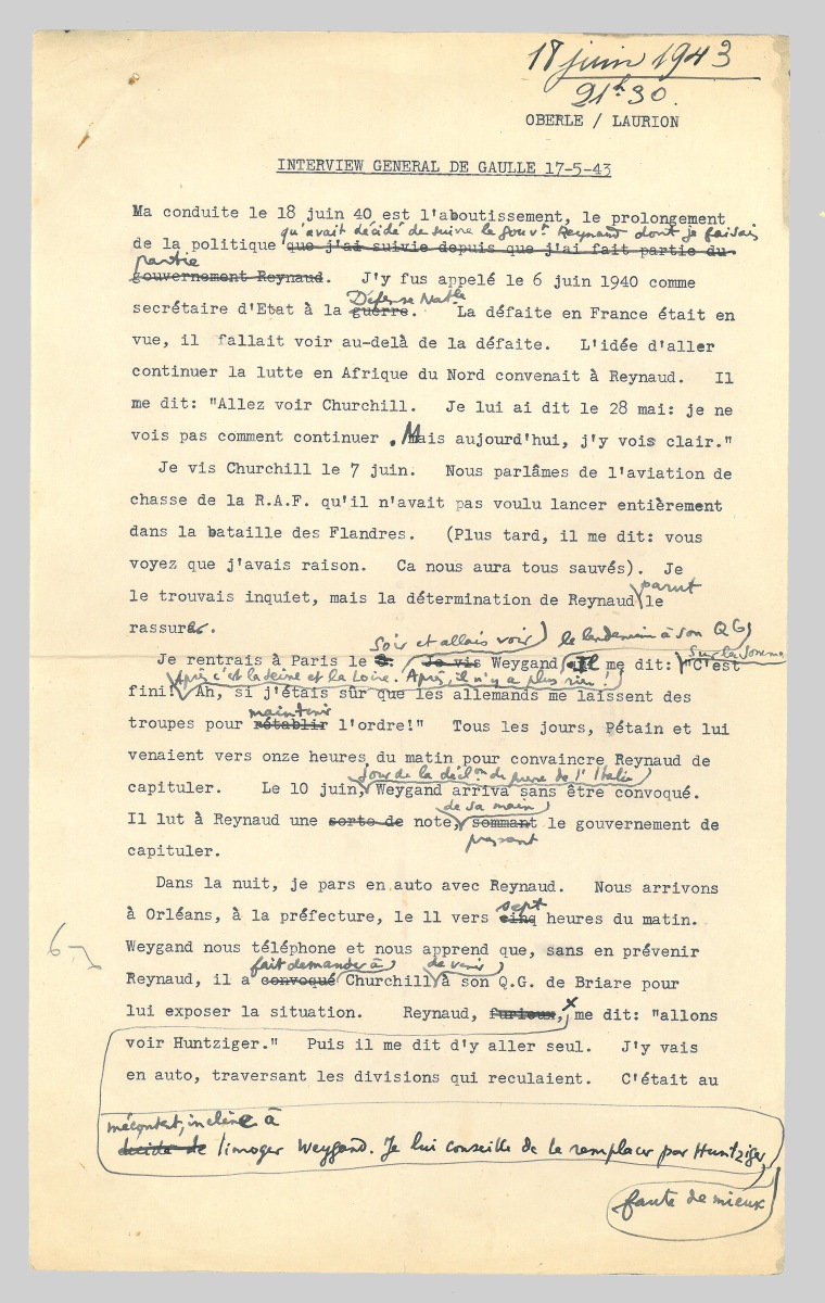 "Interview Général de Gaulle 17/5/43."(Inscription à la main : "18 juin 1943. 21h30").