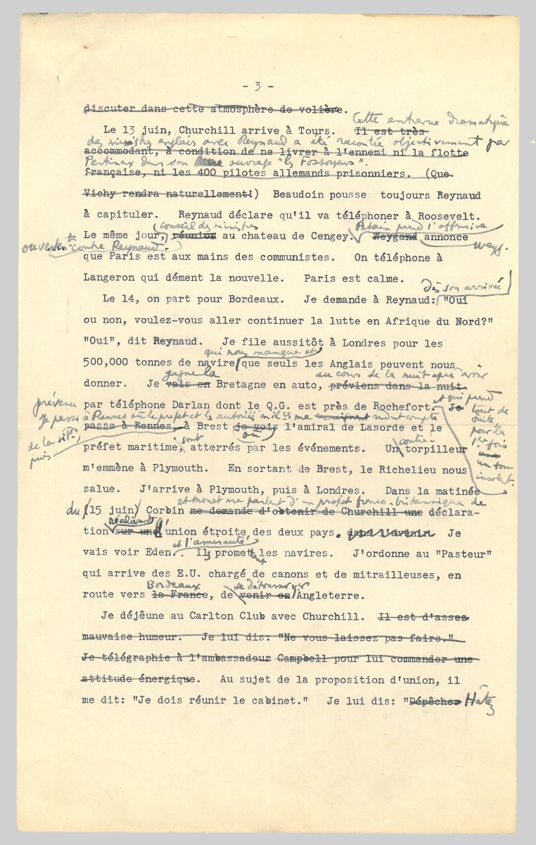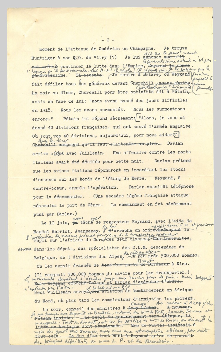 Document d'un très grand intérêt historique, donnant, sous les importants remaniements manuscrits, le texte tapuscrit originel (ou original ?) de l'interview. Il est généralement admis que le texte définitif a été revu et corrigé par de Gaulle lui-même : or toutes les corrections et ajouts sont de la main de Jean Oberlé- peut-être (?) sous la dictée du Général.