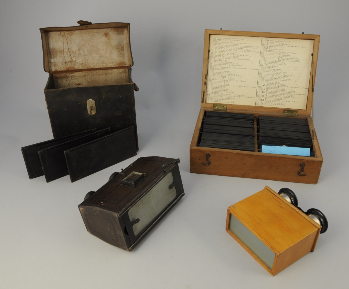 APPAREIL "LITOTE" pour prendre des vues stéroscopiques, sa visionneuse et un ensemble d'environ 252 plaques de verres, légendées et rangées dans leur coffret sur la première guerre mondiale pour l'année 1916 (Verdun).
