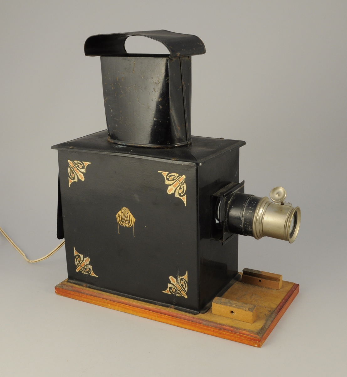 LANTERNE de PROJECTION en tôle laquée noire à décor de motifs stylisés de style Art Nouveau, fixée sur un support en bois. Objectif à lentille règlable. Avec sa lampe électrique.