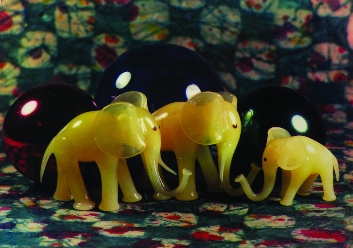 Jolies couleurs de verreries et très beau vase à l'antique en porcelaine blanche et dorée. Charmante composition aux éléphants.