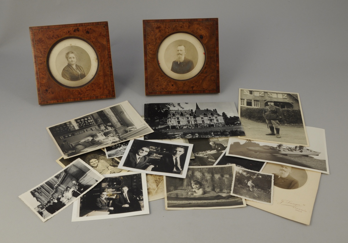 LOT d'environ 75 tirages photographiques dont portraits, mariages, famille. Deux dans des petits cadres en bois de loupe. Première moitié du XXème.