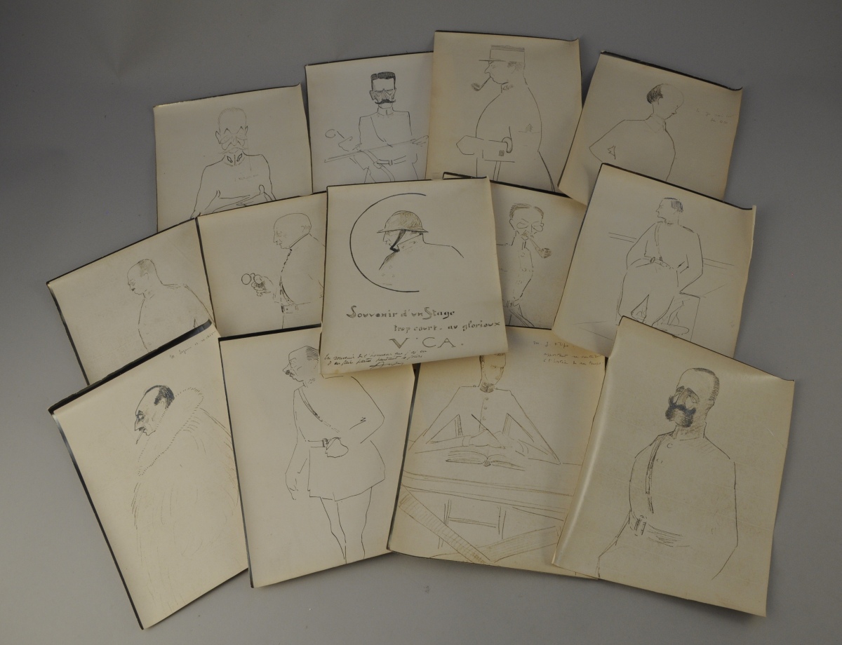 ONZE TIRAGES de croquis représentant principalement des militaires. Début XXème.