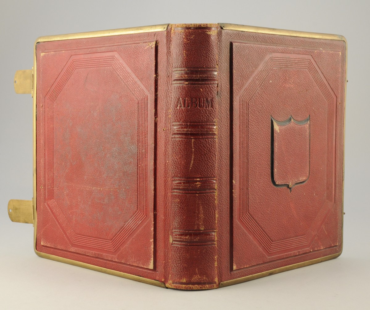 ALBUM de 96 photographies anciennes constitué d'une suite de portraits. Format in 4°. Chagrin rouge centré d'un blason. Fermoir métallique. Tranches dorées. Milieu XIXème siècle.