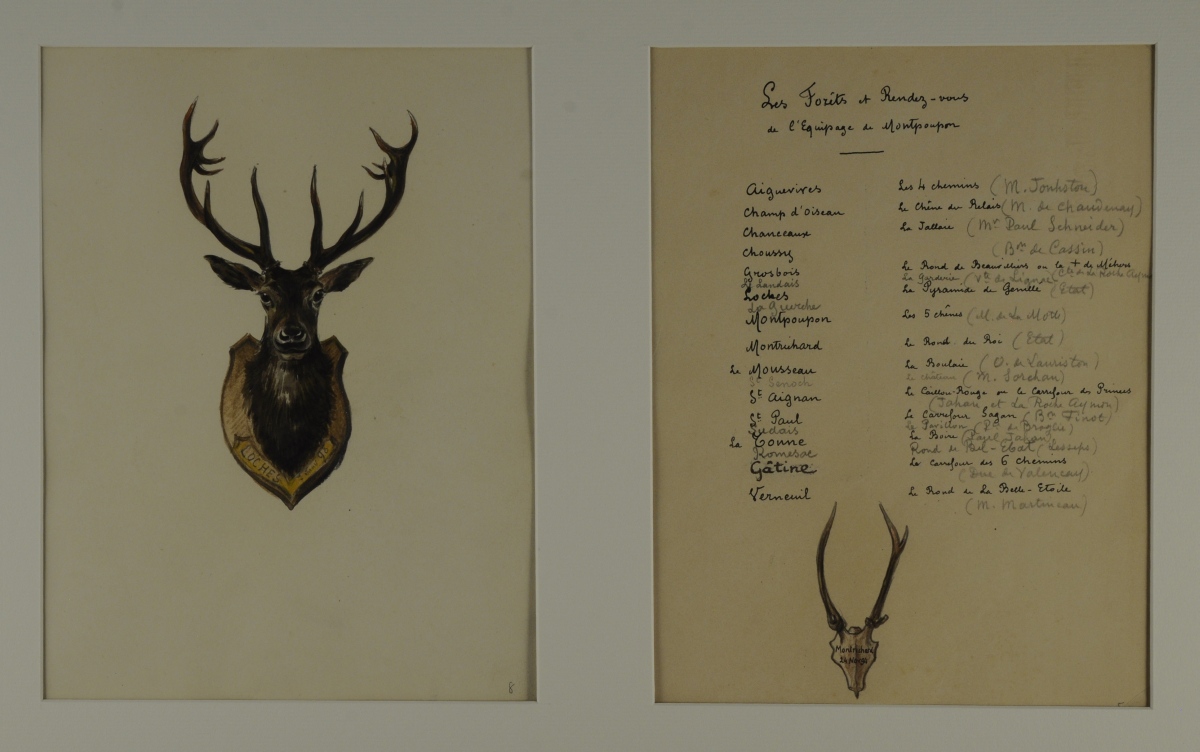 - "Les Forêts et Rendez-vous de l'équipage de Montpoupon". Avec au crayon les noms des maîtres d'équipage. Orné d'un trophée de cerf portant l'inscription "Montrichard 24 Nov 94".