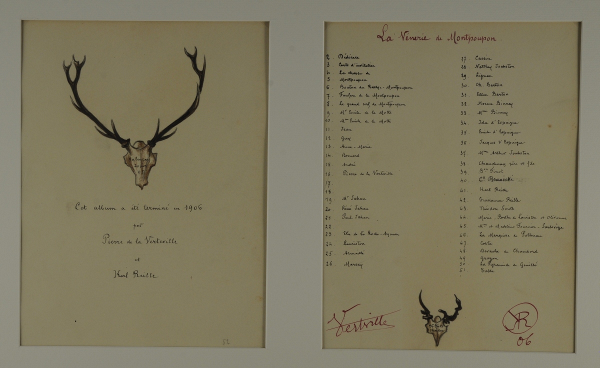 - Table des matières ornée d'un trophée de cerf portant l'inscription "26 Fèv 03 Chaillon". Signée par La Verteville et Reille et datée "06". p.51.