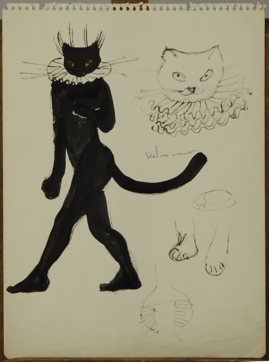 - Maquettes de costumes de CHAT à la fraise. Deux feuilles. Papier, signé en bas à droite. 23,5 x 31 cm. (tâches)