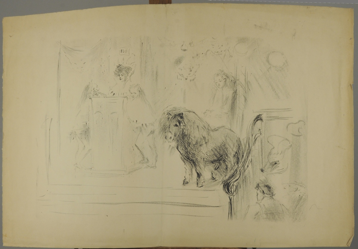 - Maquette de décor de scène au PONEY. Deux poneys. Trois feuilles. Deux crayon sur papier, l'un marqué au crayon au dos "Lola de Nobil ? / Beptec (?)" et une estampe. 24 x 32,5 et 38 x 56 cm. (usures)