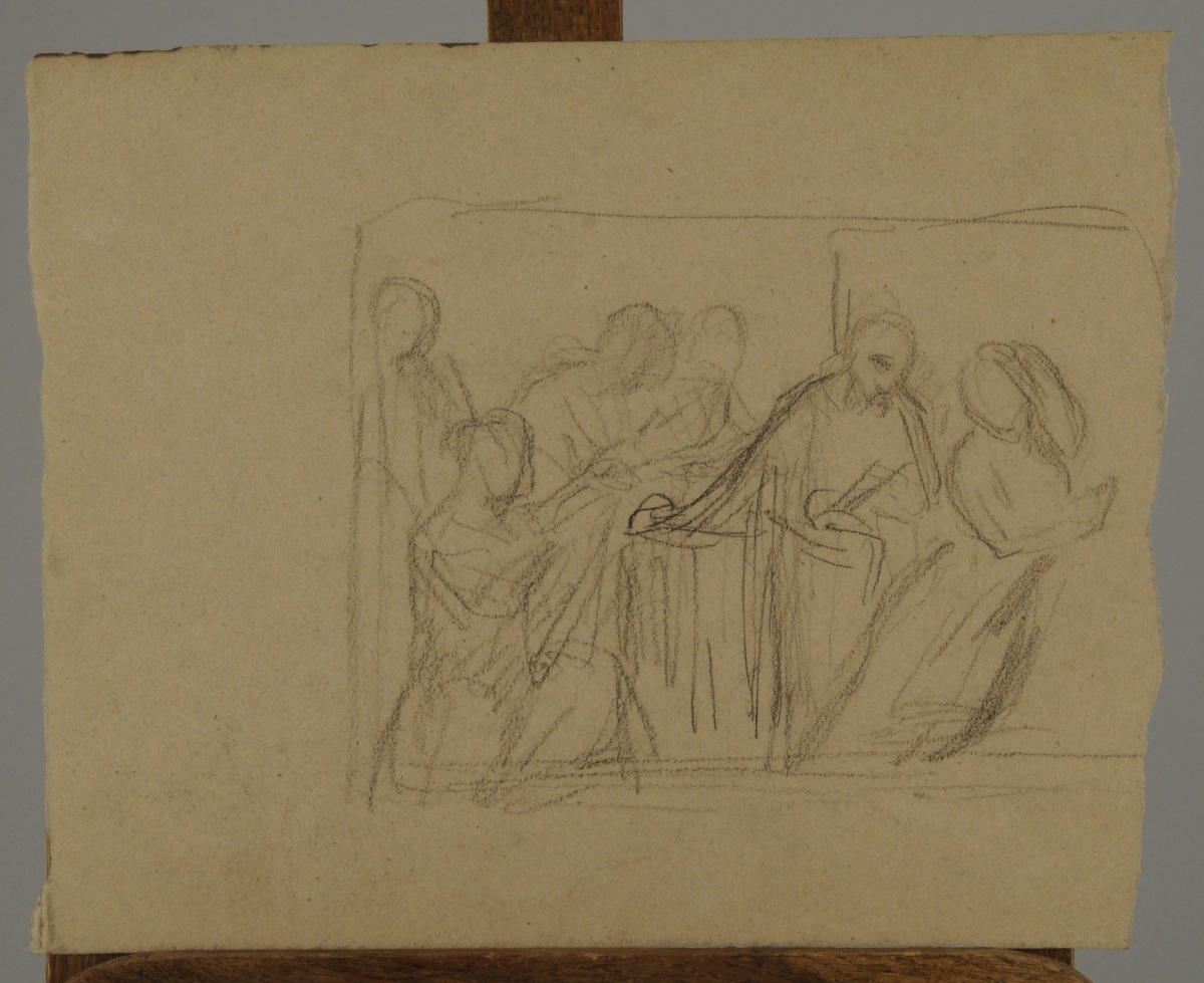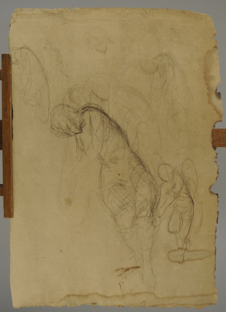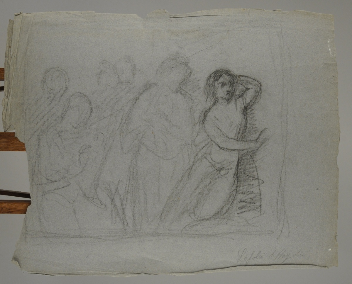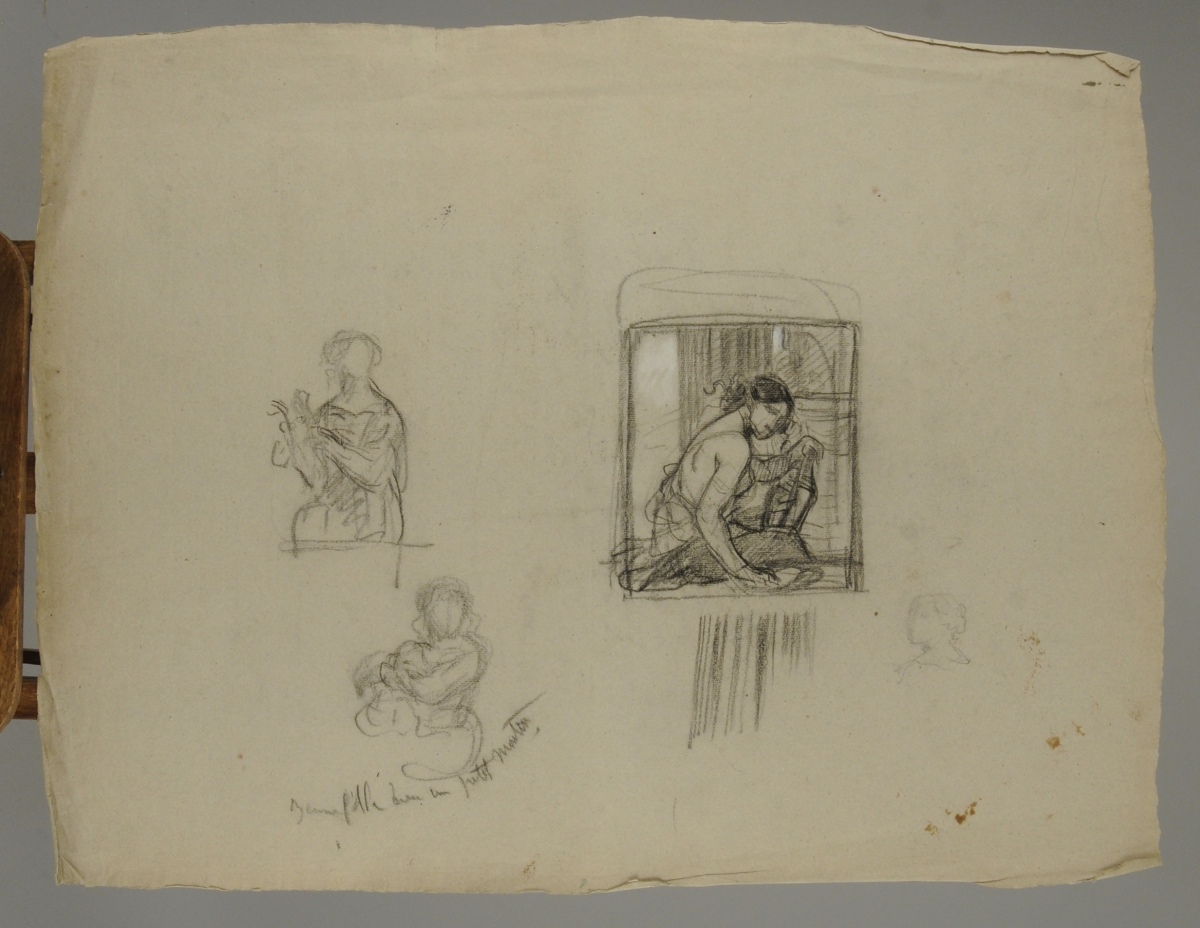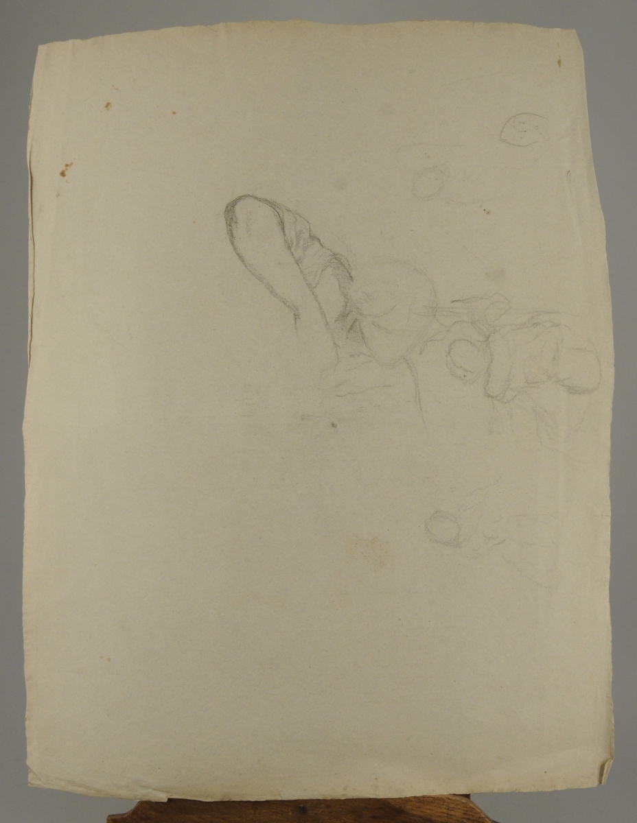 Études. 5 feuilles. Crayon noir sur papier, titrés en bas à droite. L'un rehaussé de craie blanche.